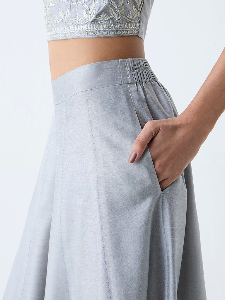 These silver palazzos from Vark serve as the perfect accompaniment to your festive looks. Designed with an elasticated waistband and side pockets. they combine comfort with effortless style.