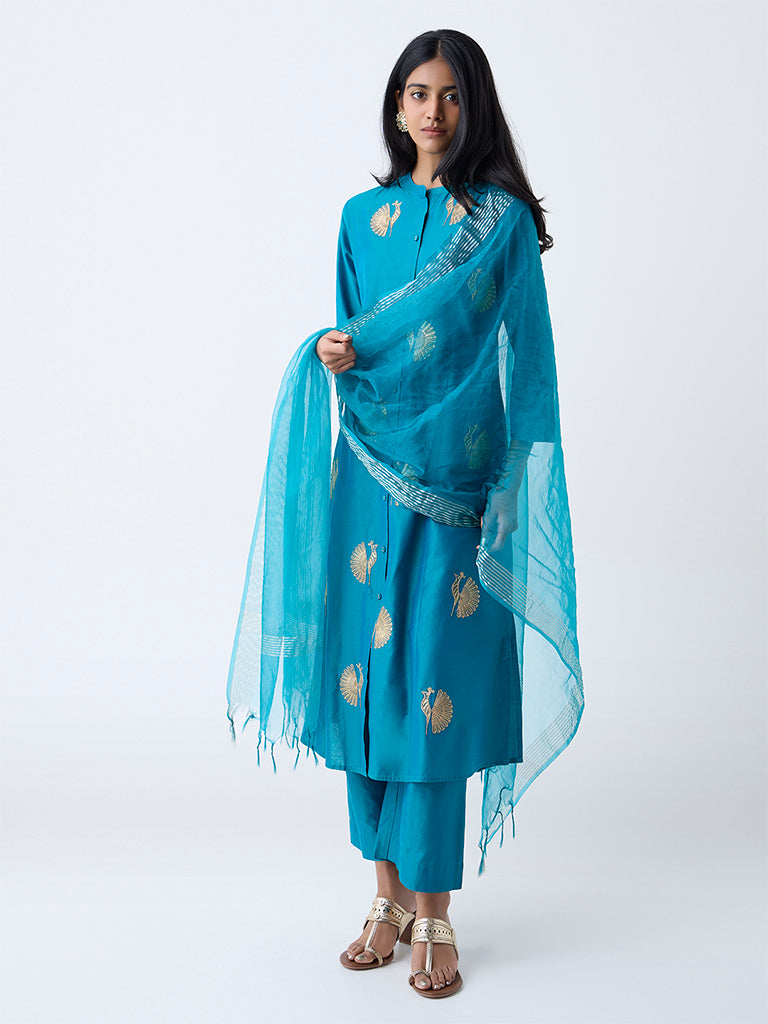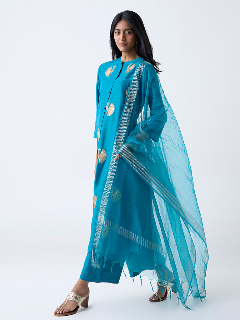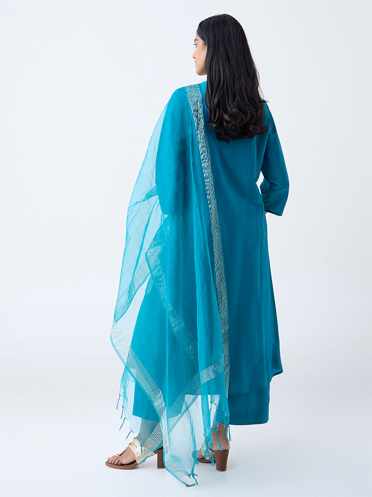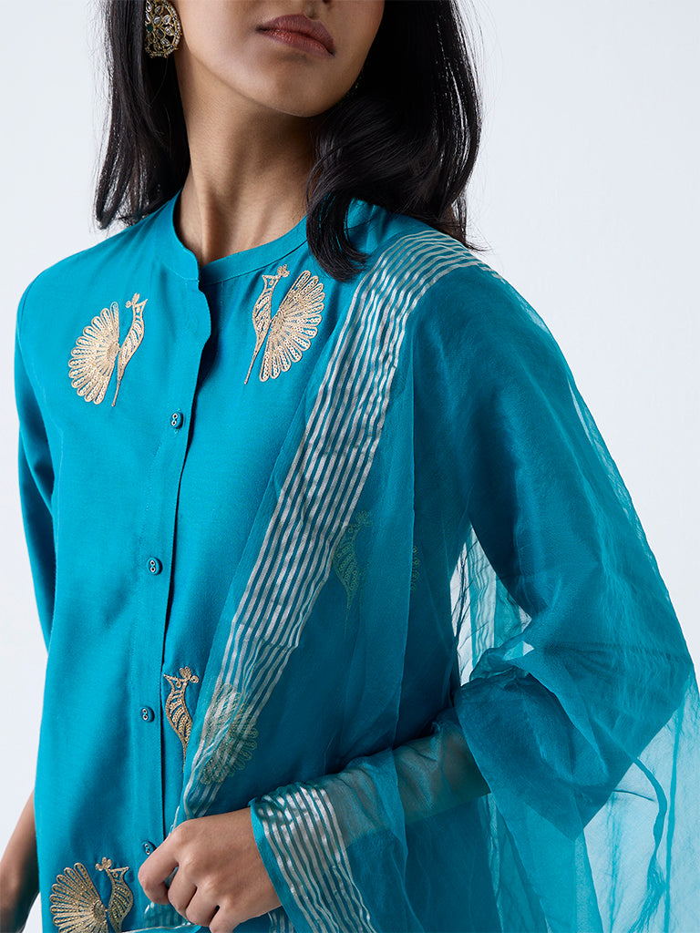 This teal ensemble from Vark is designed for the modern woman who celebrates tradition with a contemporary twist. The A-line kurta is adorned with sequin-embellished bird motifs and is complemented by a mandarin collar and three-quarter sleeves. Paired with coordinating palazzos. the set ensures comfort without compromising on style. The striped dupatta adds a touch of elegance. making this outfit perfect for festive gatherings or intimate celebrations.