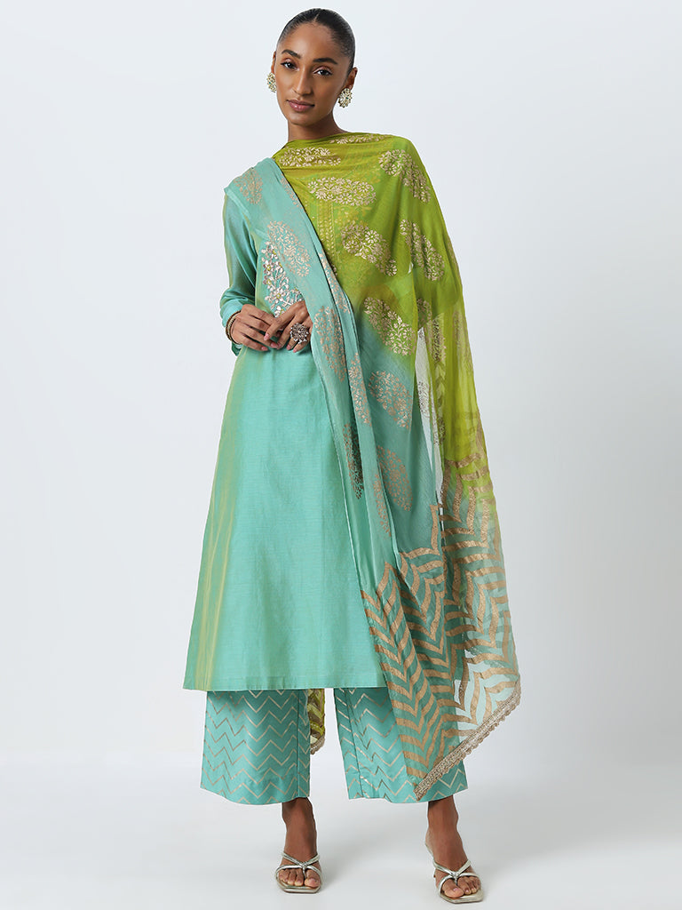 Vark launches this turquoise set including a kurta. ethnic pants and dupatta. The A-line kurta showcases floral embellishments at the yoke and is complete with a round neck and three-quarter sleeves. It is paired with chevron-printed ethnic pants featuring an elasticated waistband for a secure fit. The floral printed dupatta wonderfully complements the ensemble.