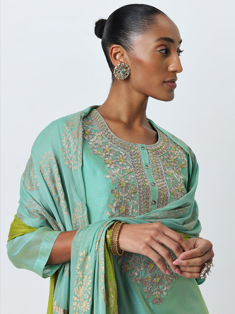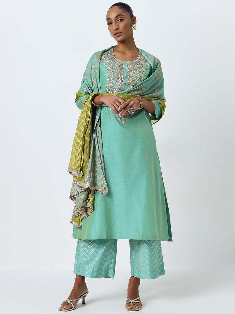 Vark Turquoise Embellished Kurta. Pants And Dupatta Set