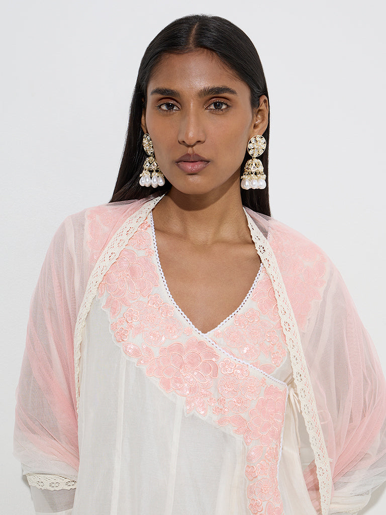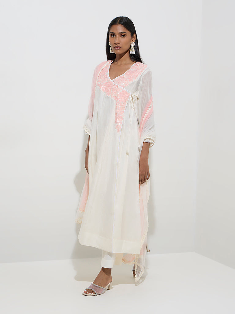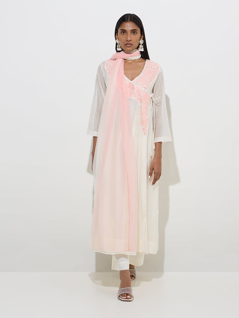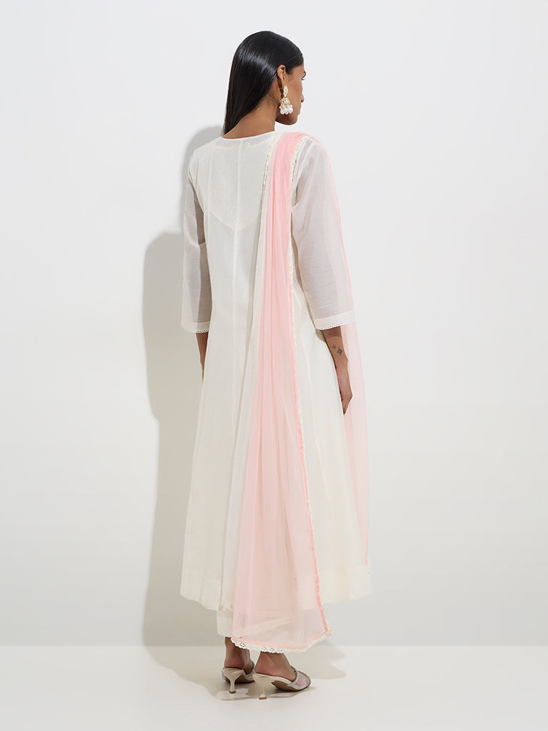 Vark White Floral Cotton-Blend Kurta. Pants and Dupatta Set