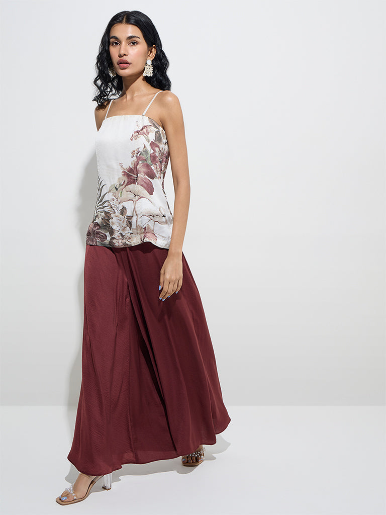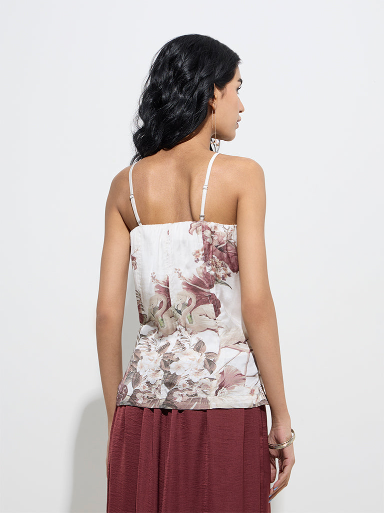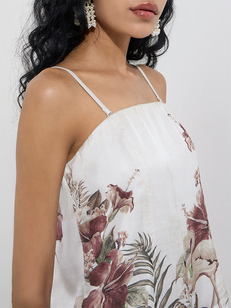 Adorned with delicate foliage prints. this white top from Vark exudes feminine charm. Crafted from lightweight fabric for effortless comfort. it features a flattering square neckline and adjustable straps. ensuring a customized fit with every wear.