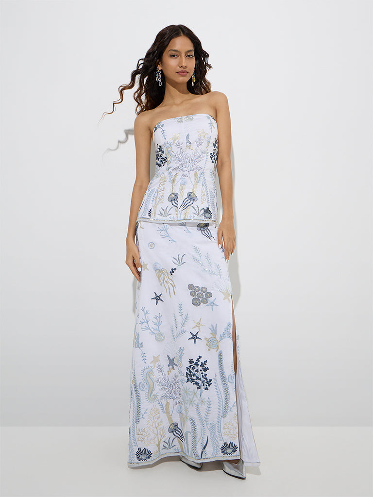 Vark launches this white ethnic top featuring exquisite sea-themed sequin embroidery for a festive charm. Made from quality fabric. it comes with adjustable shoulder straps. allowing it to be styled as a tube top for added versatility.