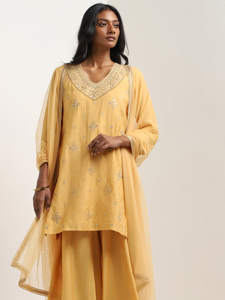 Vark Yellow Embellished Kurti. Palazzos and Dupatta Set