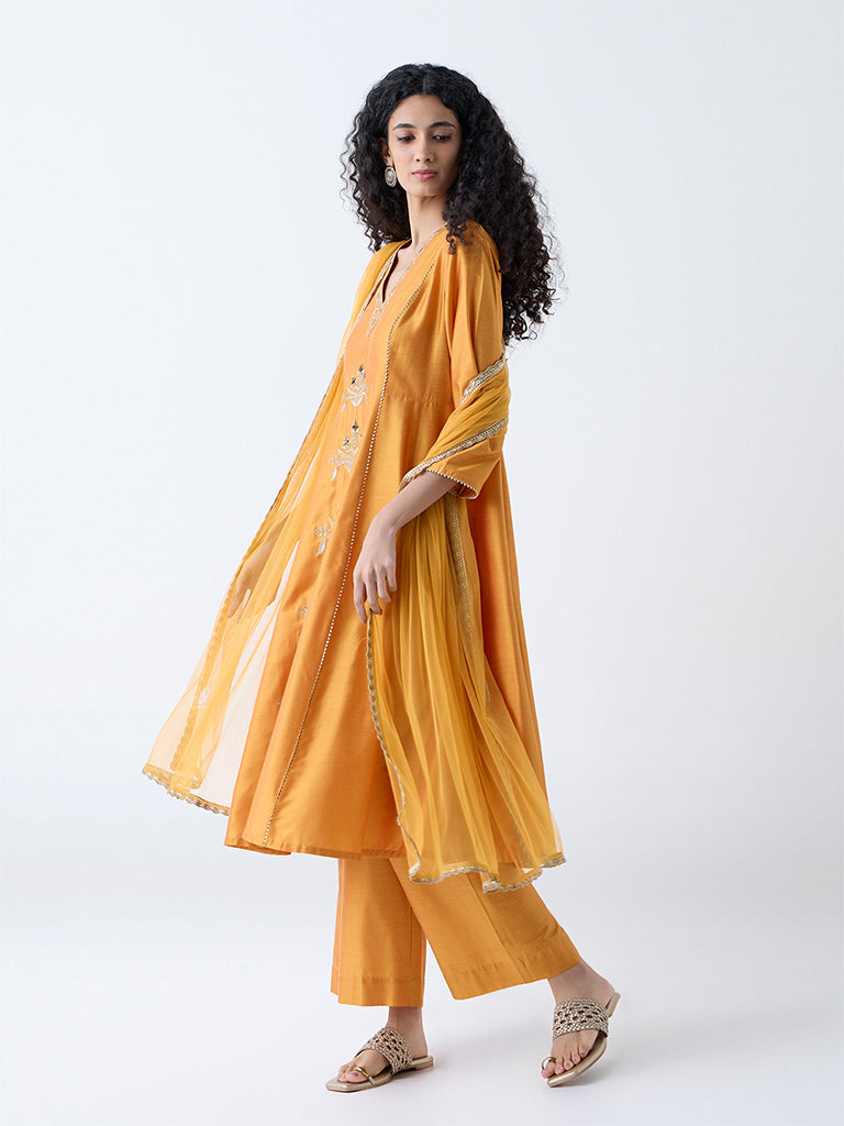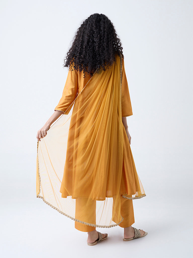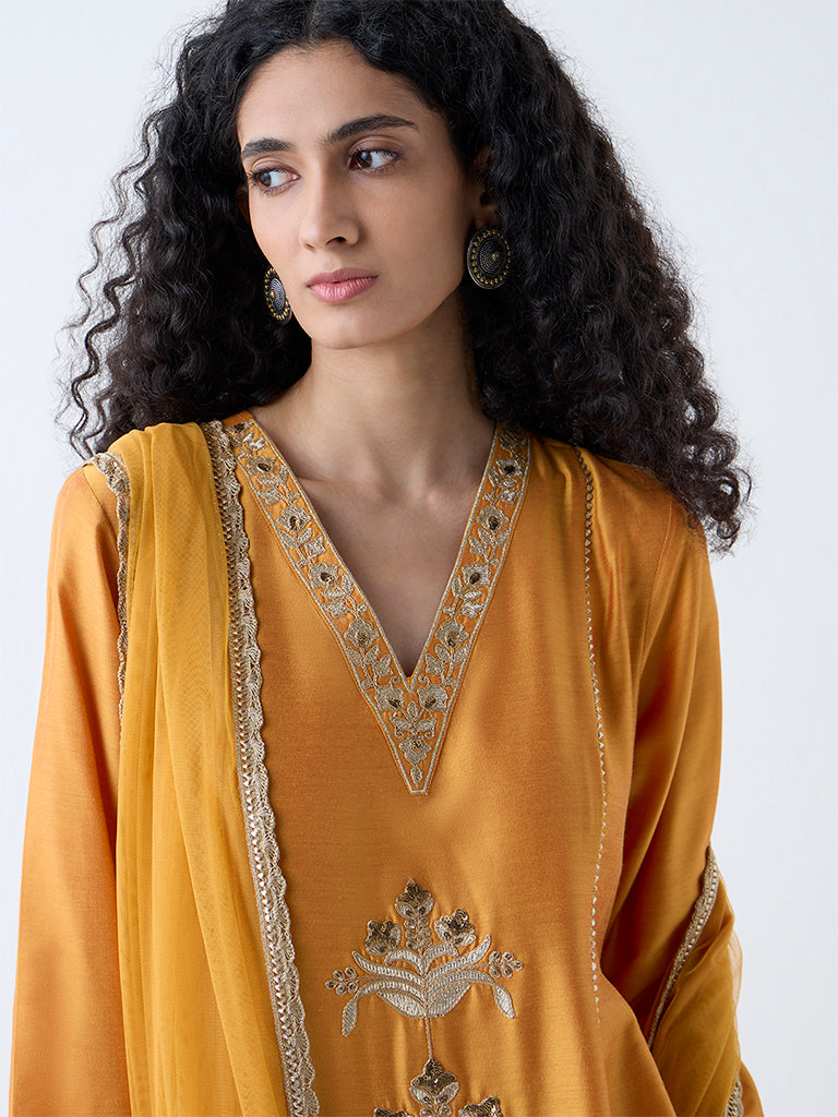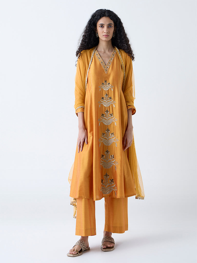 Embrace festive elegance with this yellow ethnic set from Vark. Milled from a breathable fabric. the Anarkali-style kurta is adorned with intricate zari embroidery and includes a V-neck and three-quarter sleeves. Paired with coordinated palazzos featuring an elasticated waistband. the set is completed with a sheer net dupatta for a complete ensemble.