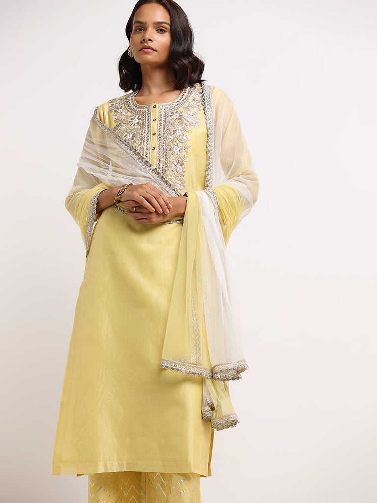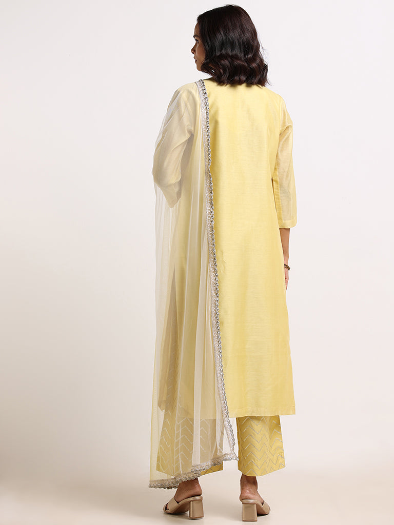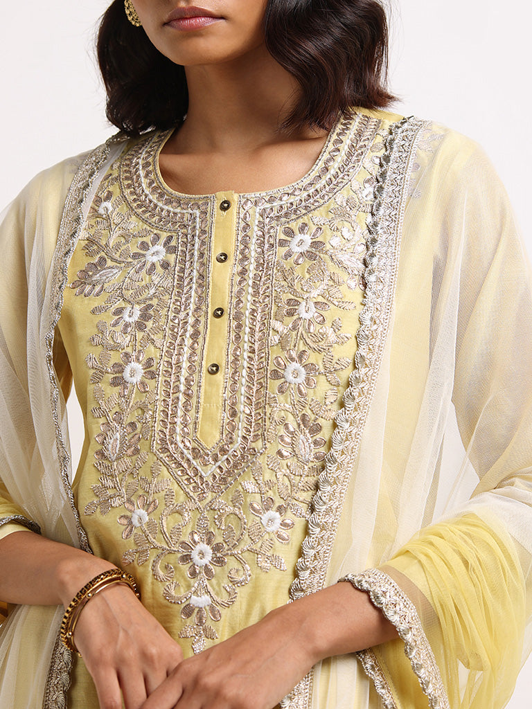 Yellow 3pc set. round neckline. three-quarter sleeves. embroidered gotta work yoke. netted dupatta with border. and printed chevron palazzos by Vark.