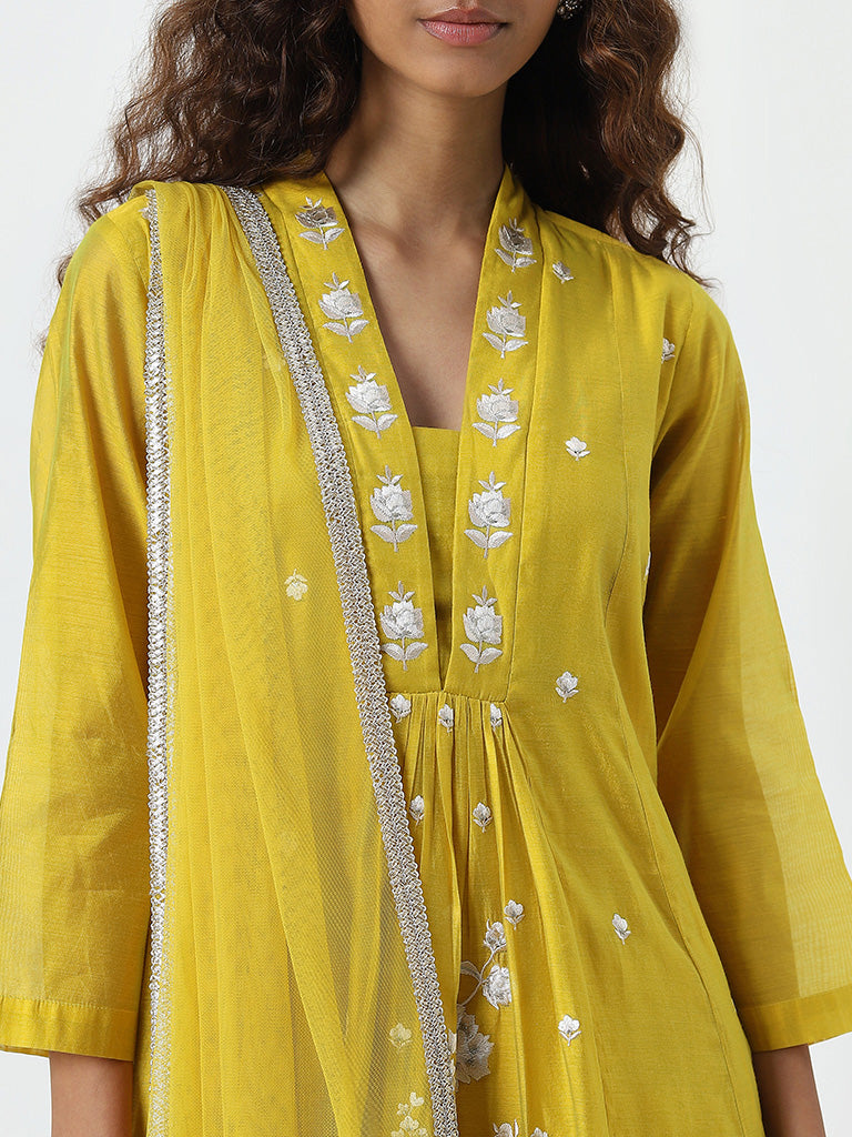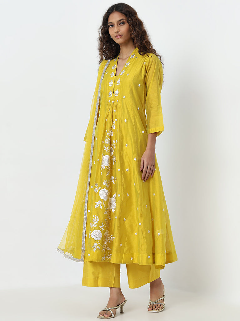 Vark brings you this yellow ethnic wear set featuring a floral embroidered kurta. pants. and dupatta. The kurta offers a fit and flare silhouette including pleated design. v-neckline and three-quarter sleeves. High-rise pants are designed with a smooth elastic waistband and zari-bordered net dupatta.