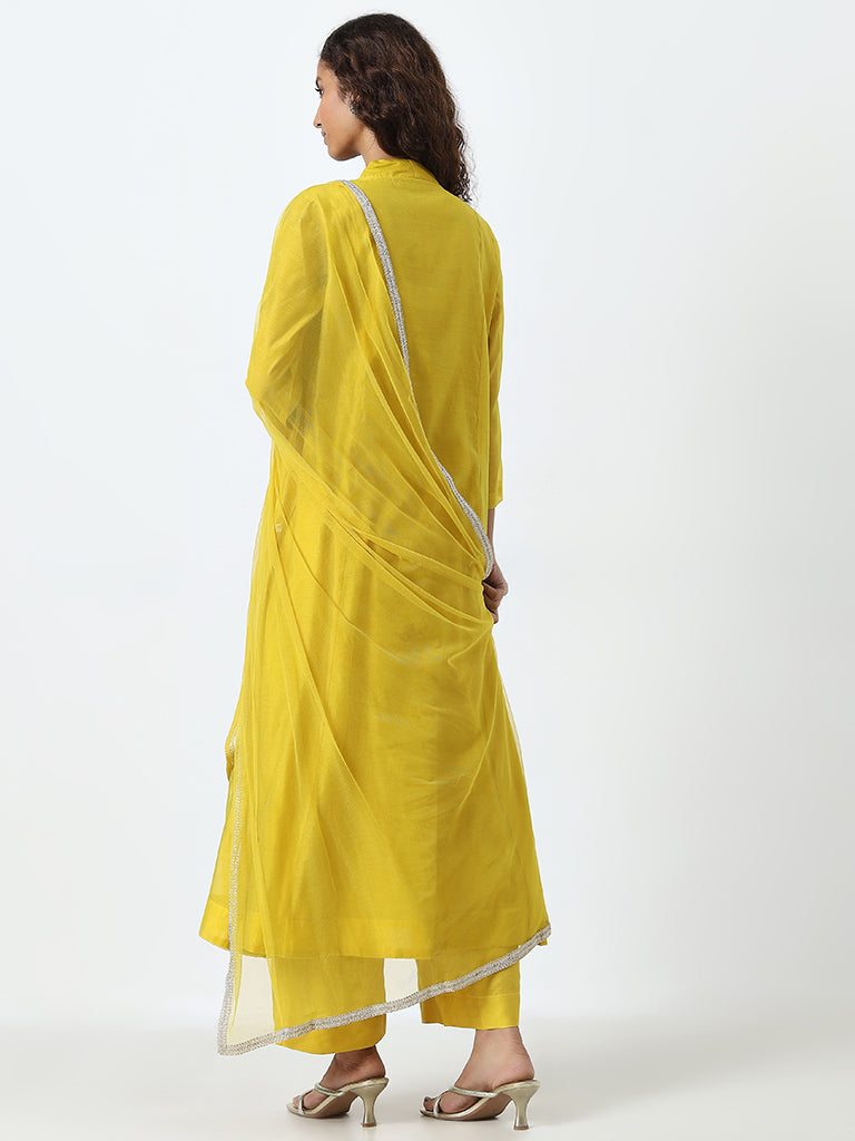Vark Yellow Floral Embroidered Kurta. Pants and Dupatta Set