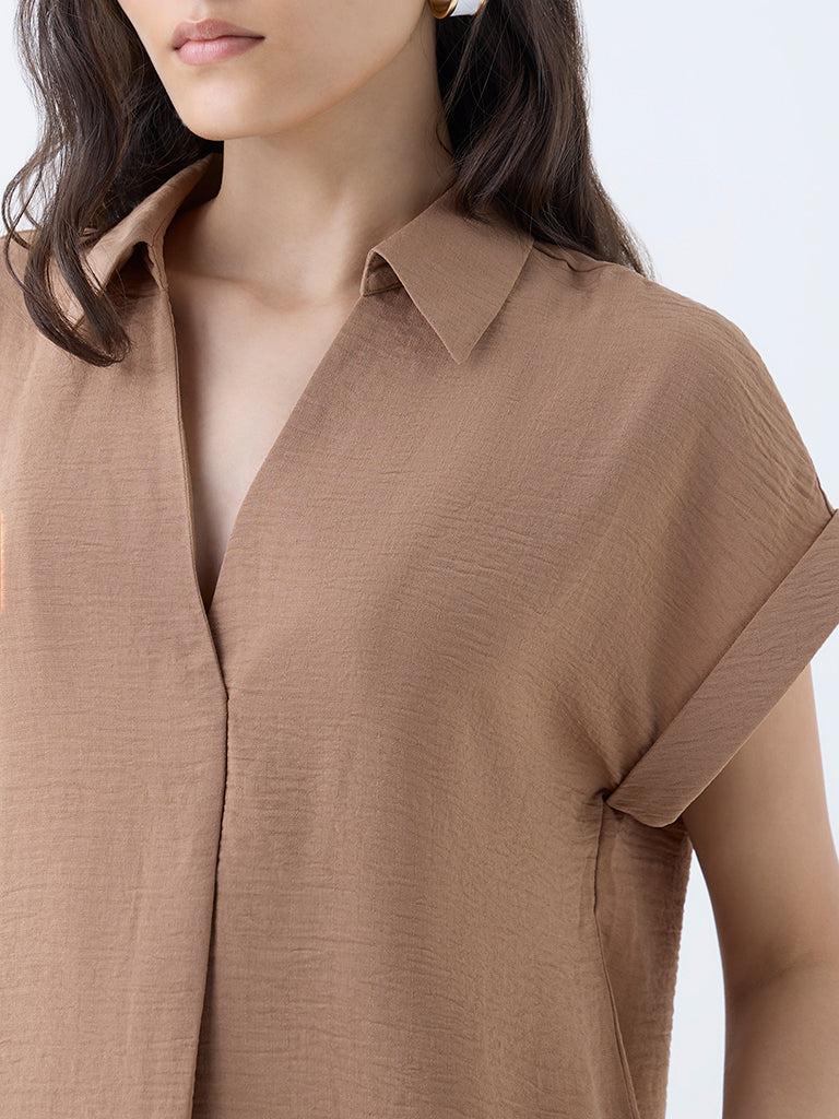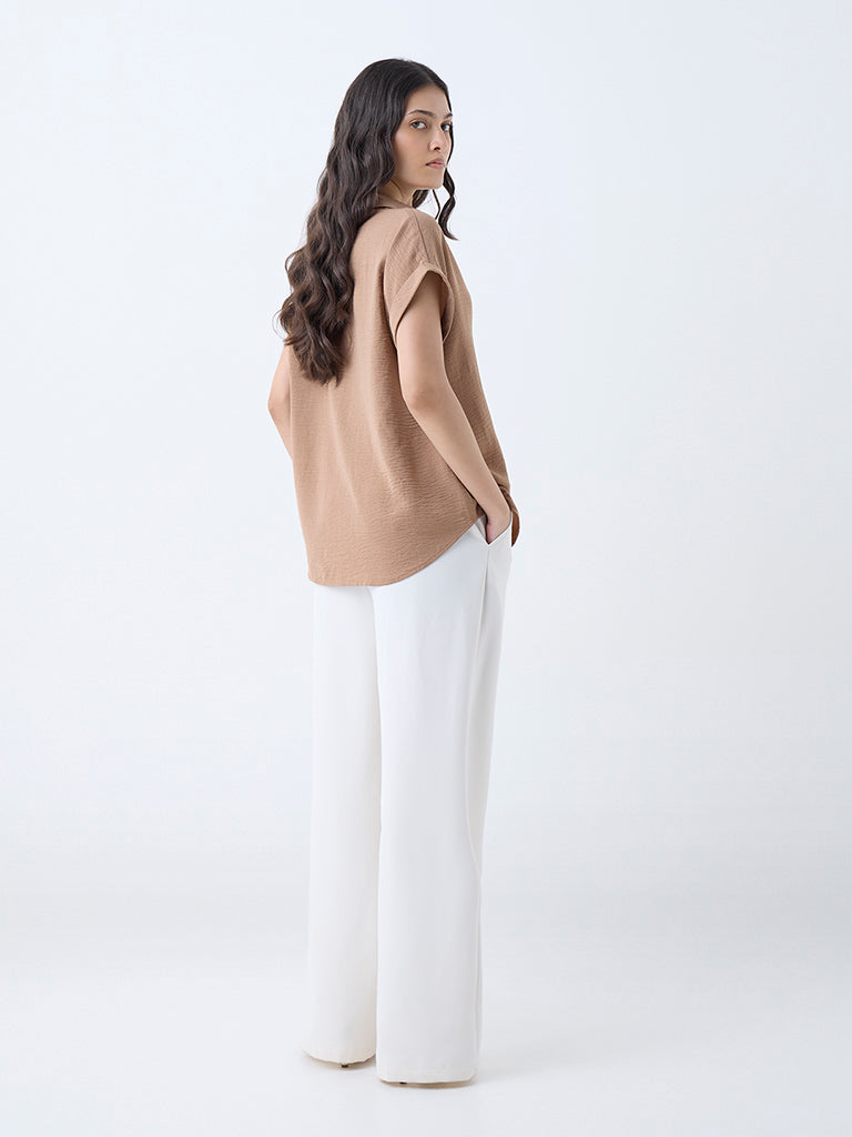 Tailored from a crinkle-textured fabric for sumptuous comfort. this beige top from Wardrobe balances structure with softness. Featuring a defined V-neck collar and upturned dolman sleeves. it’s ideal for layering under sharp tailoring or wearing solo with pared-back separates.