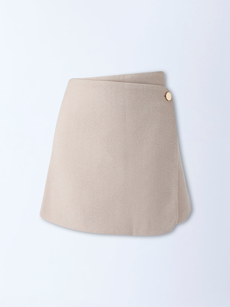 Effortlessly sophisticated. this beige mini skirt from Wardrobe is crafted from supple faux suede in a chic wrap-around design secured with a statement button. The smooth high-rise waistband and side zip detail create a structured silhouette that feels modern yet timeless.