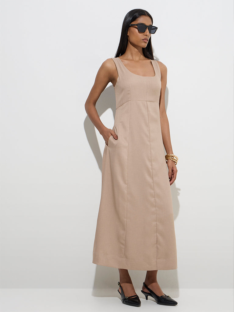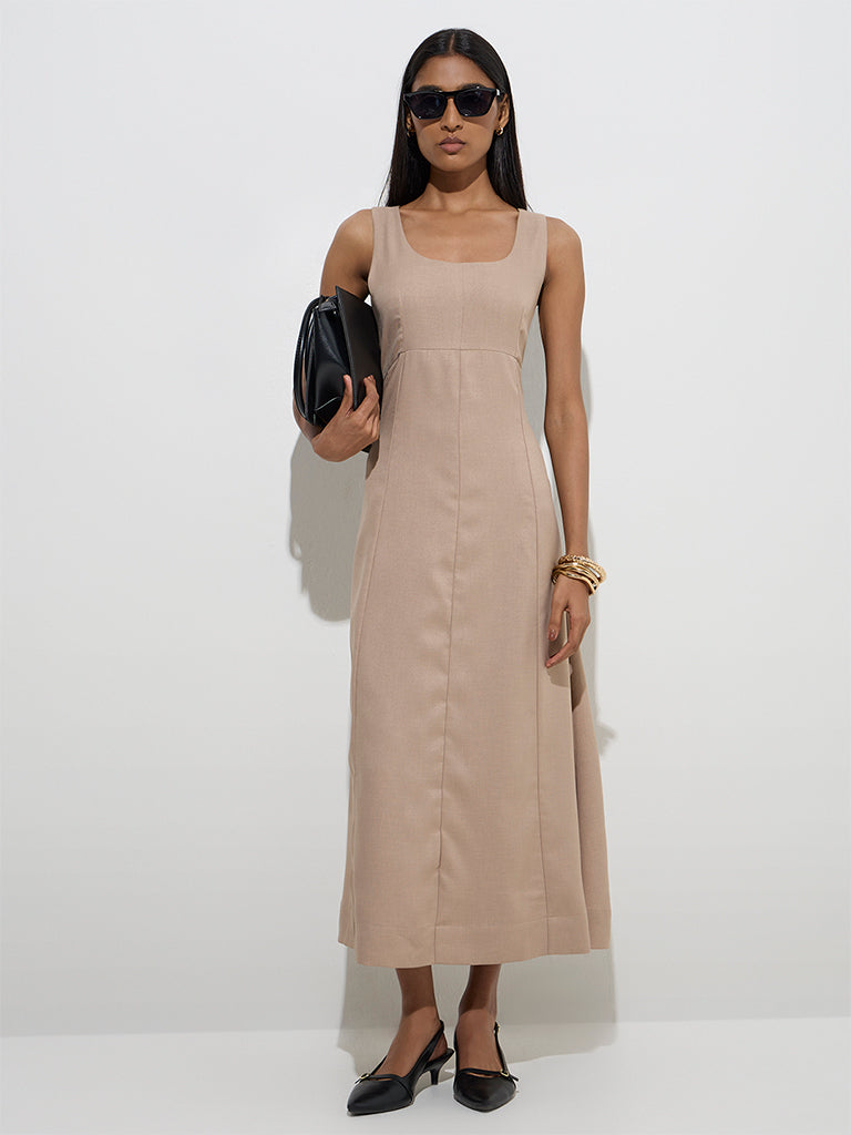 This beige dress from Wardrobe is structured in a streamlined A-line silhouette that exudes understated elegance. Framed with a scoop neckline and sleeveless design. it’s created from a breathable fabric for a refined yet comfortable finish.
