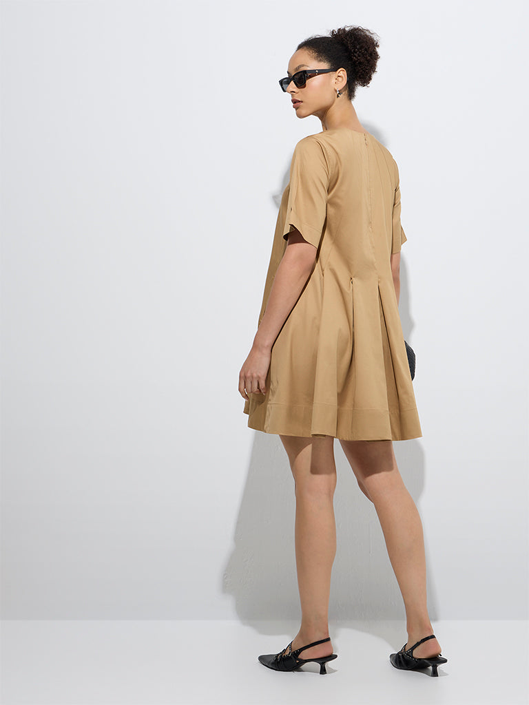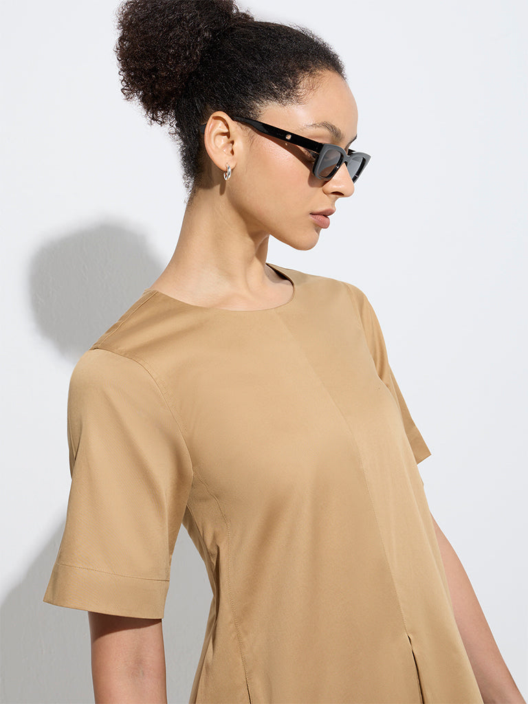 This beige dress from Wardrobe embraces understated elegance with its minimalist design. Woven from pure cotton. it flaunts box pleats at the back. complemented by a round neck and half sleeves for a refined silhouette.