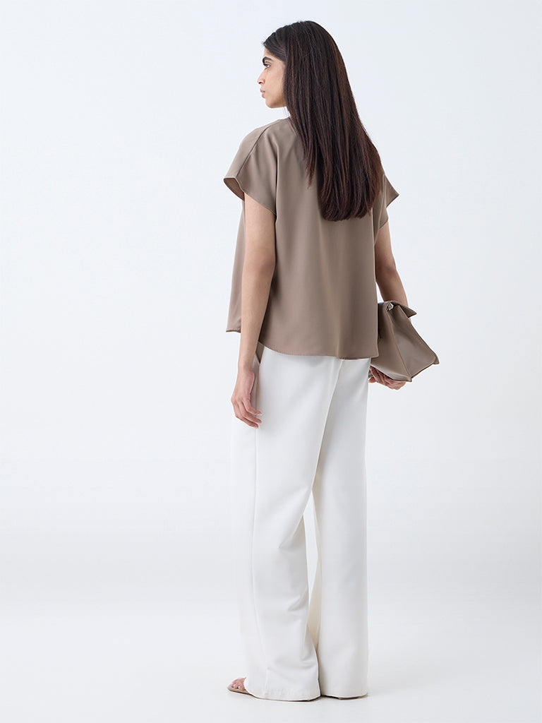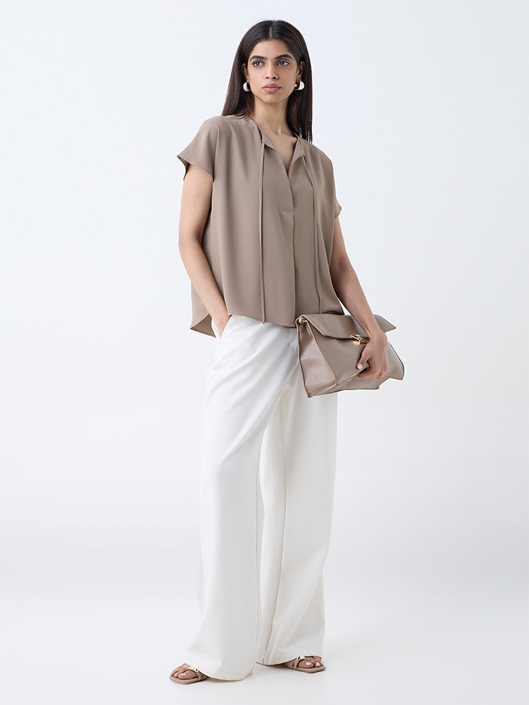 Wardrobe reimagines minimalist elegance with this beige top. crafted from an ultra-lightweight fabric that moves gracefully with every step. The V-neck with a tie-up detail adds a touch of sophistication. while dolman sleeves bring refinement to the overall look.