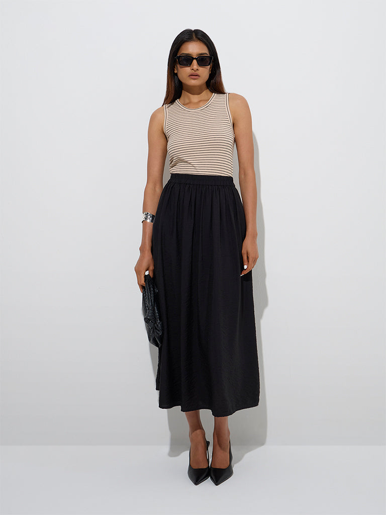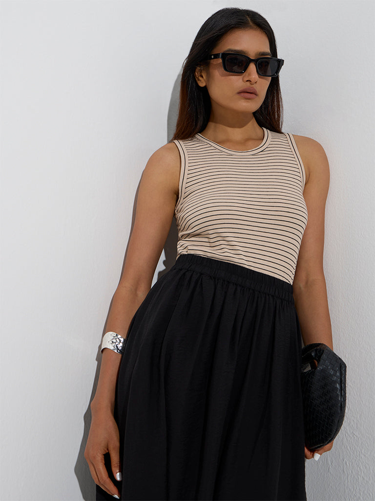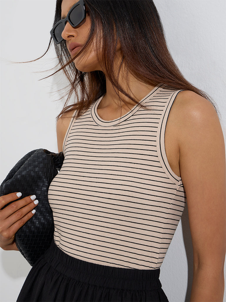 This beige top from Wardrobe is defined with stripe patterns for a timeless look. Created from a lightweight fabric for elevated comfort. it is finished with a round neckline and a sleeveless cut for a breezy finish.