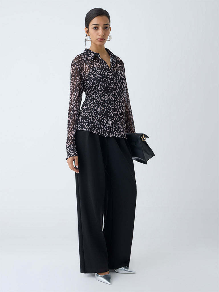 Wardrobe presents this black mesh shirt patterned with abstract prints for a distinct appeal. Designed with a cutaway collar. full sleeves and a button-up front. it creates a refined. fitted silhouette. Woven from soft. lightweight fabric. it ensures comfort through the day. The soft inner adds coverage and completes the design with a polished. layered finish.