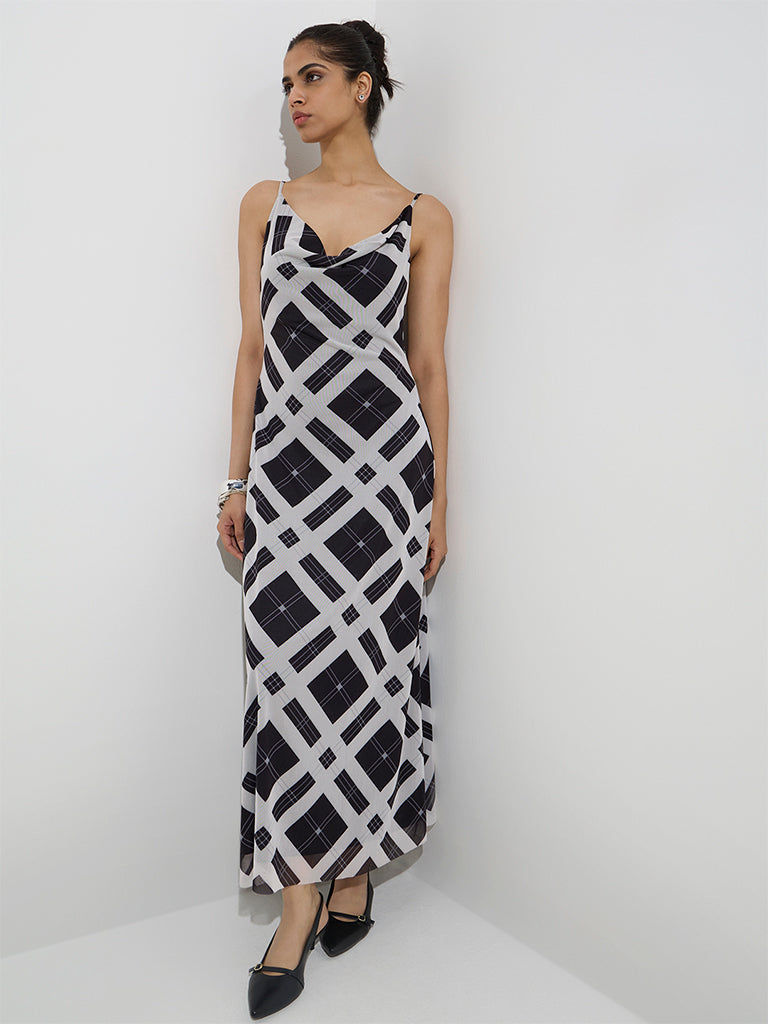 Wardrobe unveils this black dress adorned with striking checkered motifs. Designed in airy. lightweight fabric. it drapes beautifully with a chic cowl neck and a sleeveless silhouette.
