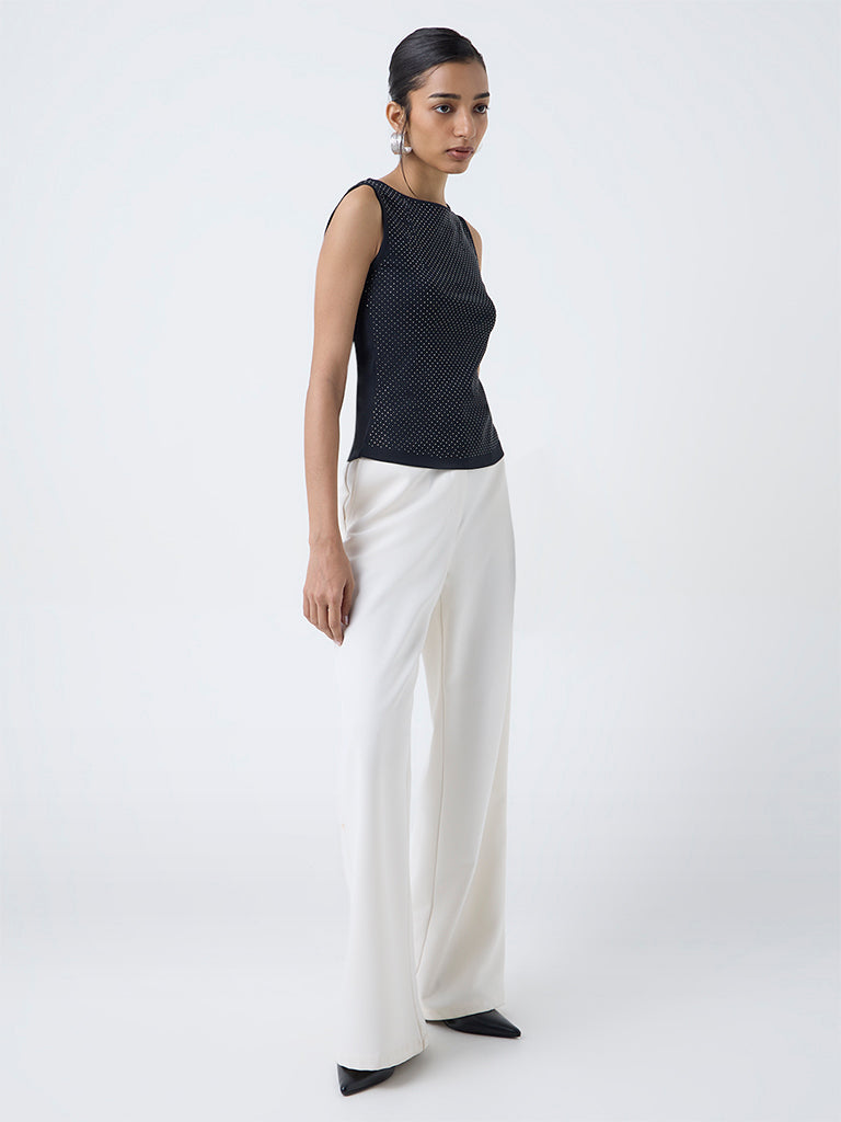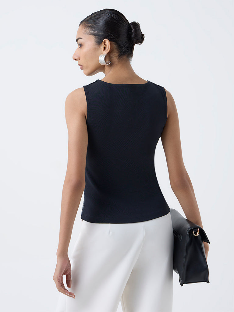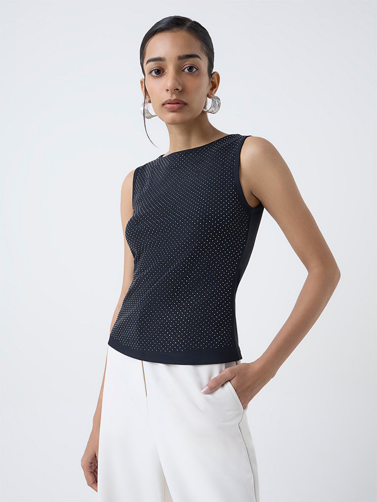 Polished and versatile. this black top from Wardrobe is embellished with subtle shimmer accents that elevate its clean silhouette. Crafted from a soft cotton-blend fabric. it features a round neckline and sleeveless cut for a sleek finish.