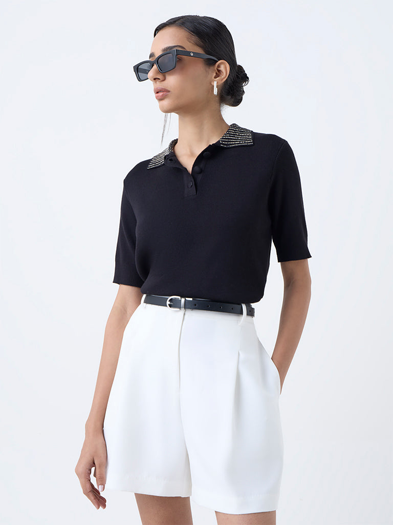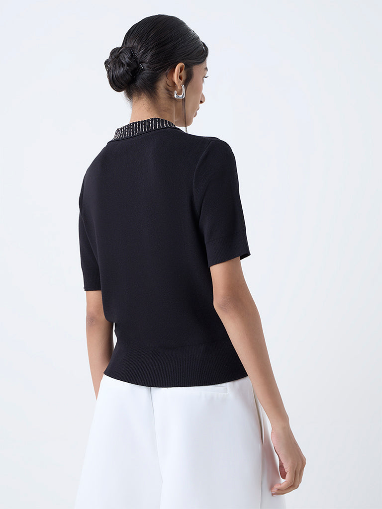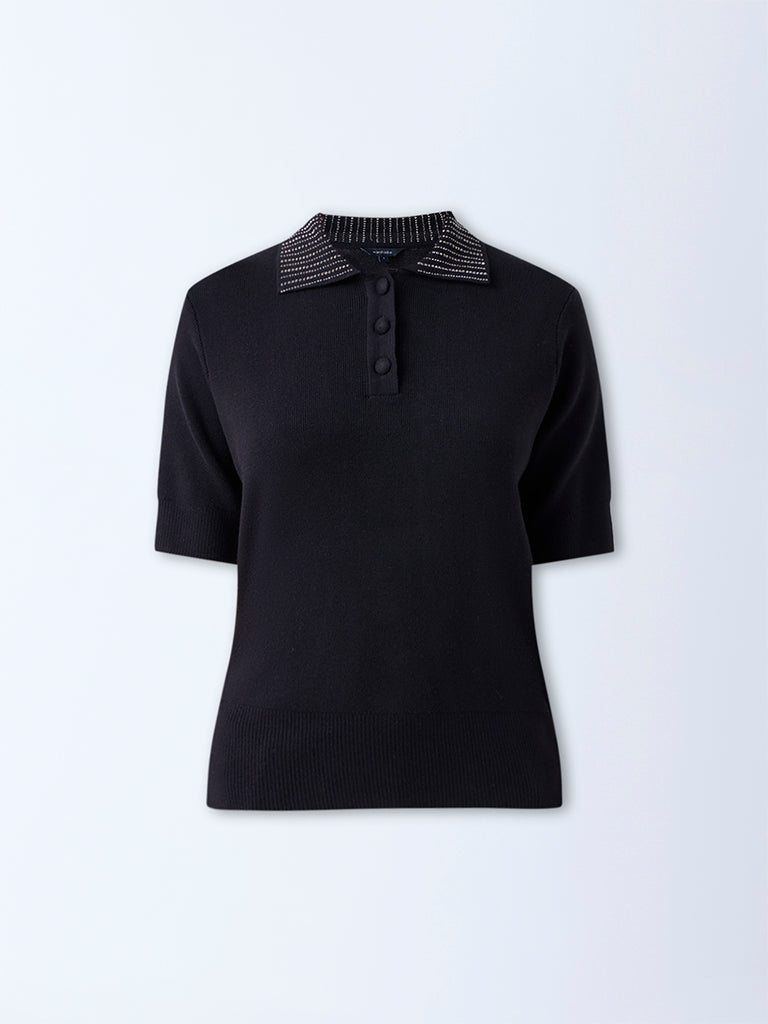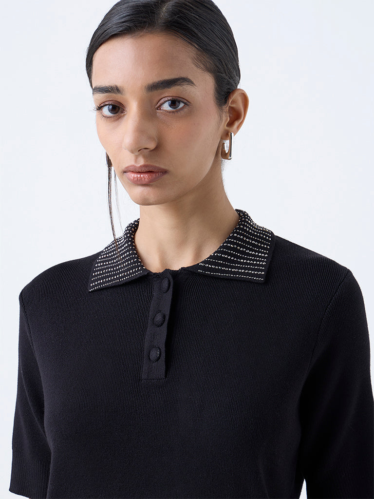 Wardrobe presents this black Polo T-Shirt elevated with delicate sequins embroidery for a subtle shimmer. Designed with a spread collar leading into a brief button-down front and short sleeves. it is crafted from quality fabric to ensure both comfort and style.
