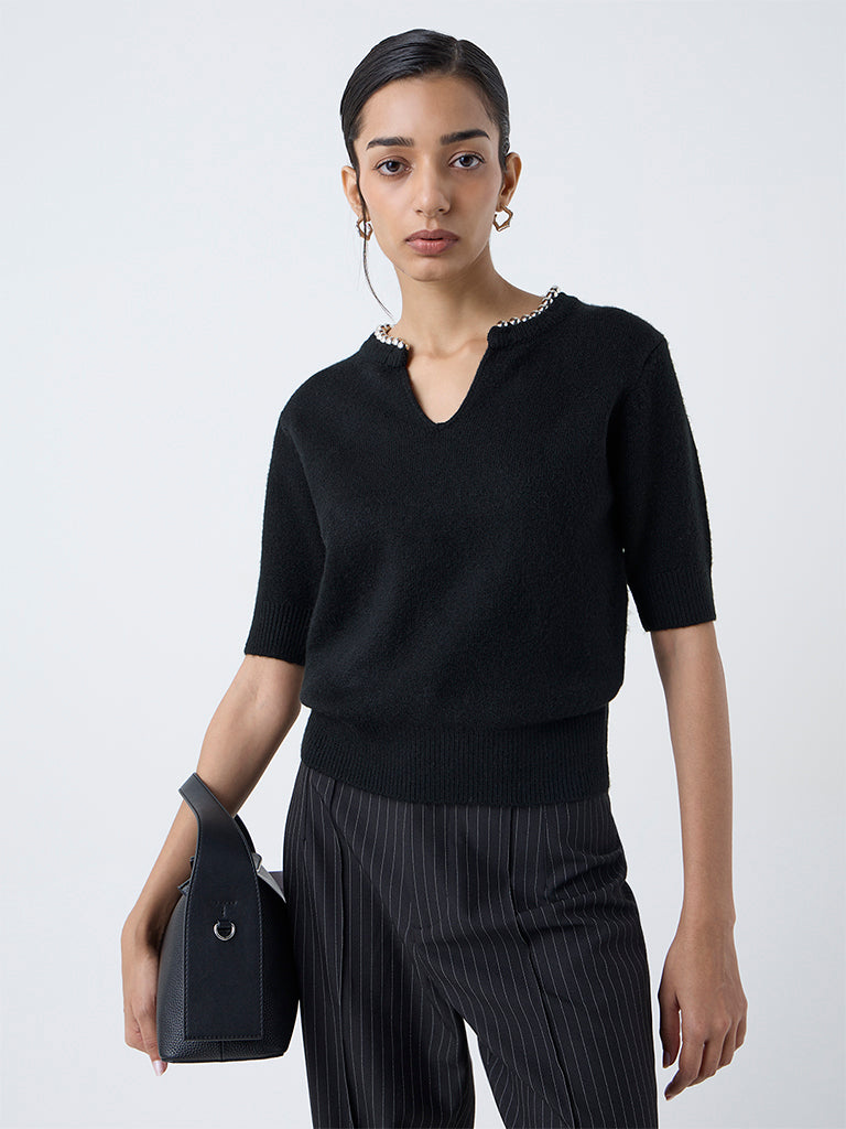 This black top from Wardrobe boasts a little shimmer on a minimalist silhouette. Featuring embellished floral motifs along the shoulder line. it is framed with a round neck and short sleeves. Woven from a soft. breathable fabric. it ensures comfort while maintaining an occasion-ready appeal.