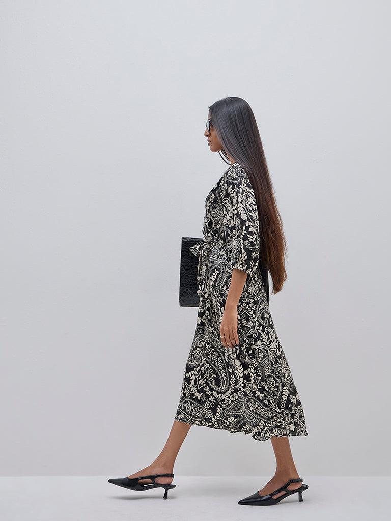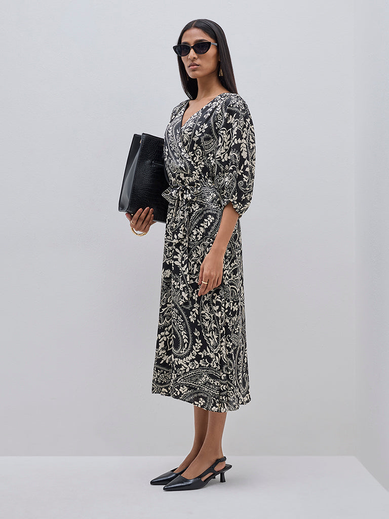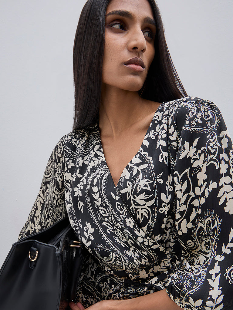 Wardrobe launches this black dress with belt presented in appealing floral prints. It is made with soft and breathable fabric and offers an elegant A-line silhouette. The wrap-style V-neck and long puffed sleeves complete this semi-formal wear.