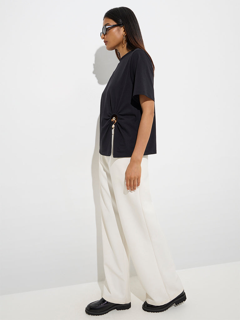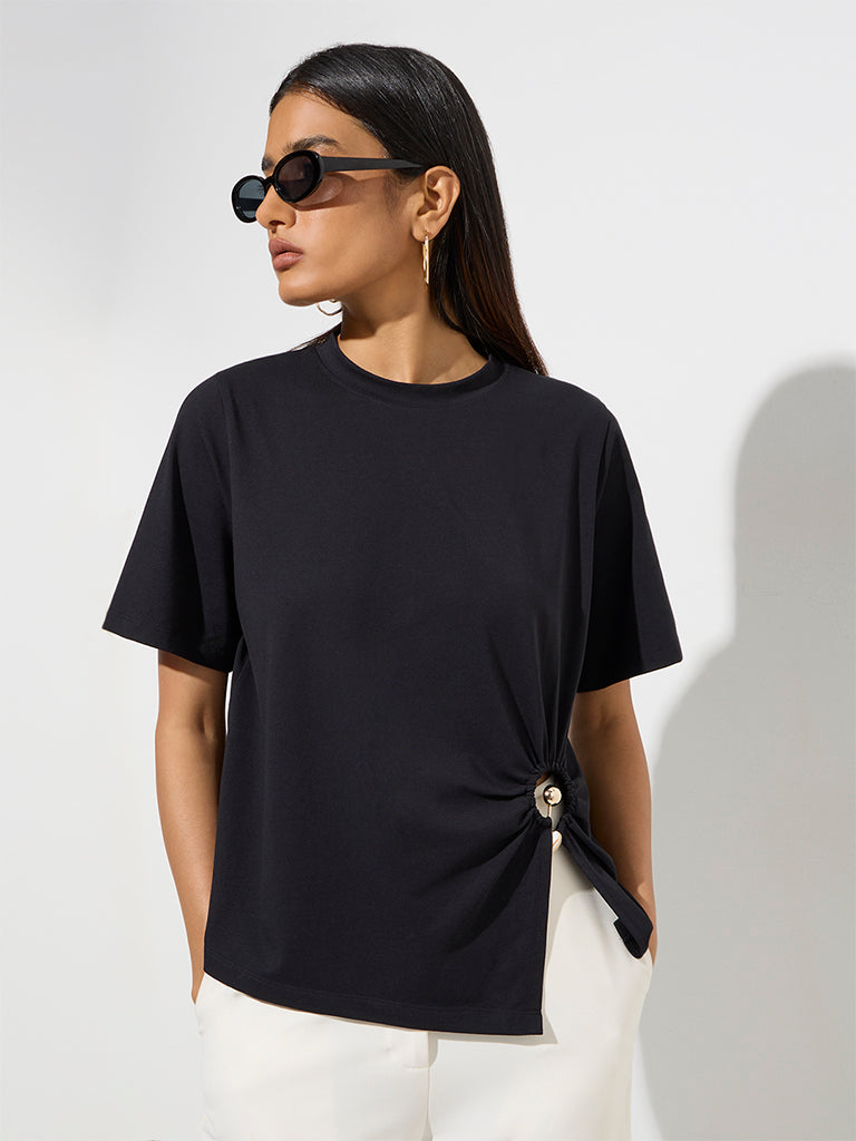 This black t-shirt from Wardrobe flaunts a metal detail along the hem. adding a polished twist to a classic silhouette. Crafted from a premium fabric blend. it’s framed with a round neckline and half sleeves.