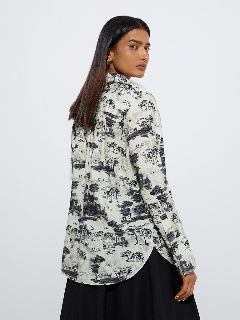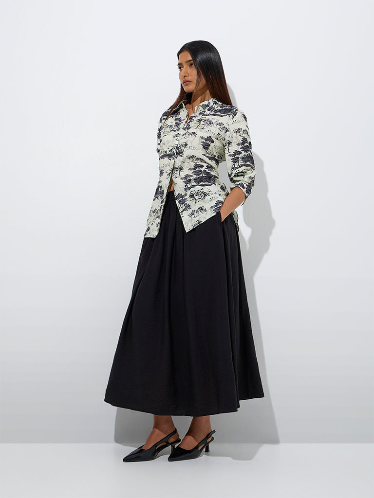 This black shirt from Wardrobe is adorned with nature-inspired prints for an elevated look. Spun from a lightweight fabric. it features a spread collar that flows into a classic button placket. while the full sleeves with buttoned cuffs add a tailored touch to its relaxed silhouette.