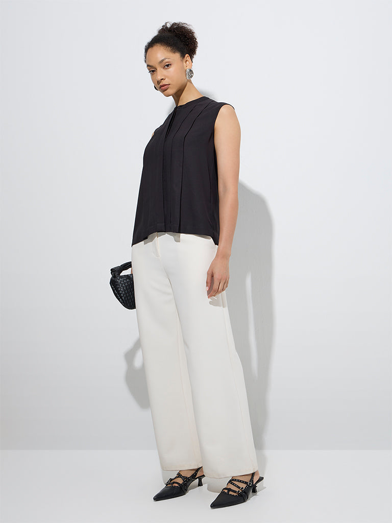 This black top from Wardrobe is fashioned with pintuck detailing for a refined touch. Made from a breathable fabric. it features a band neck that flows into a concealed button placket. while the sleeveless cut offers a modern finish.