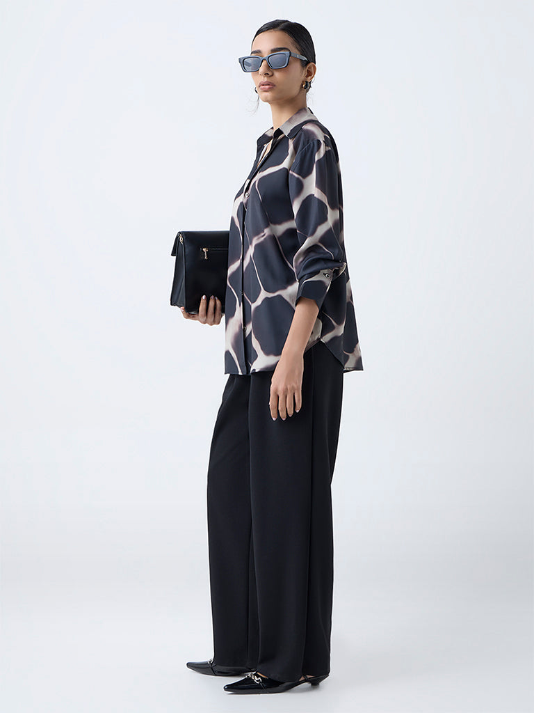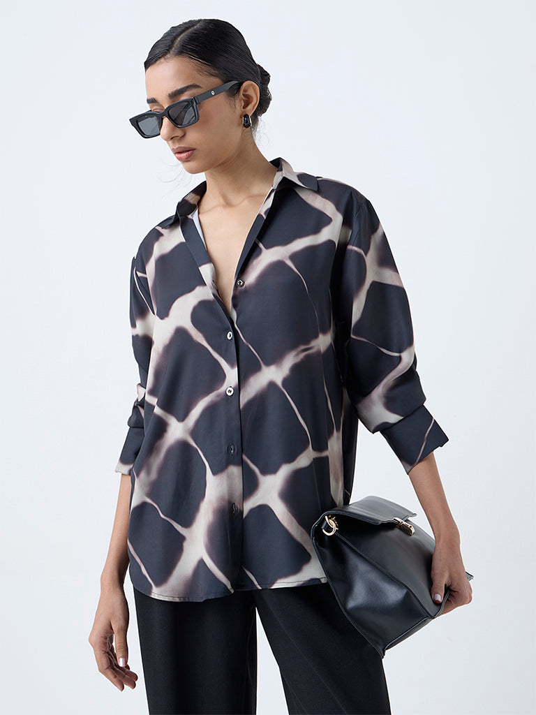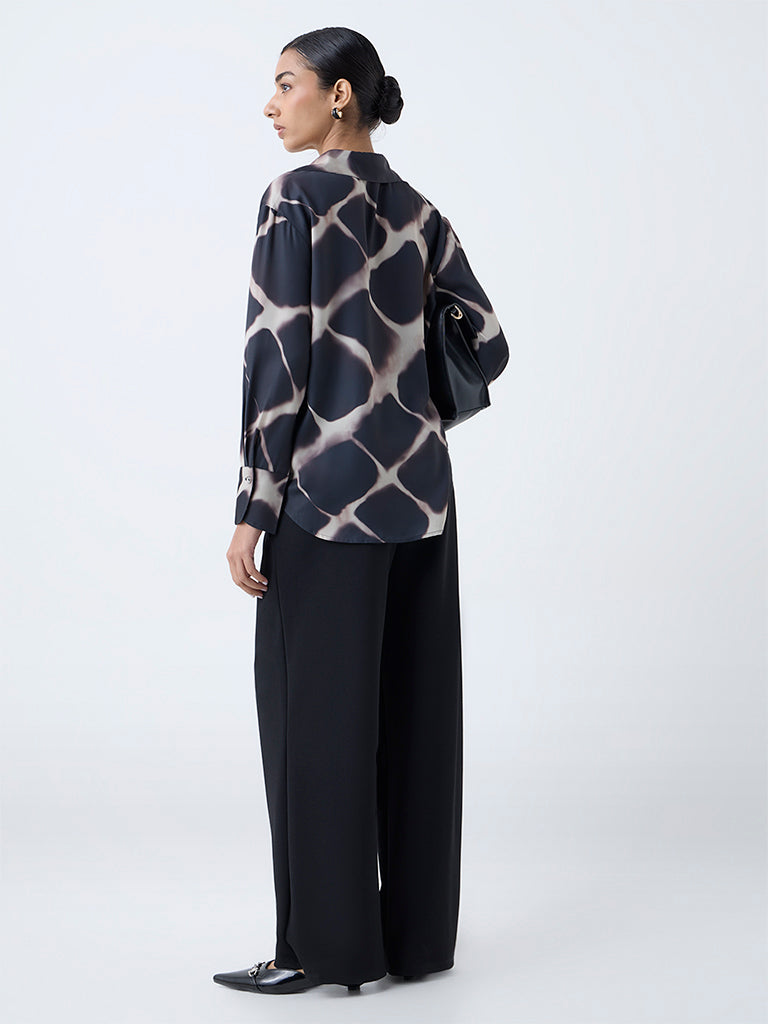 Wardrobe introduces this black tunic adorned with a delicate floral print. Crafted with a spread collar. button-down front and full sleeves. it brings a refined balance of comfort and elegance to everyday wear.