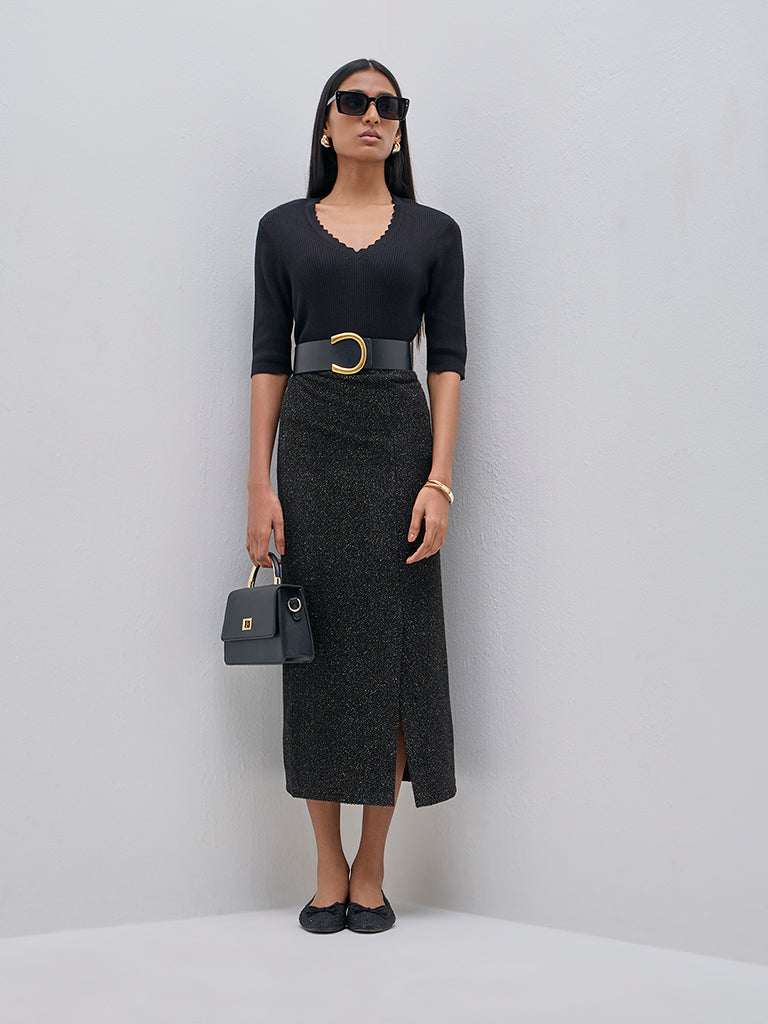 This black sweater by Wardrobe features a zig-zag designed v-neckline and half sleeves. The garment is crafted with ribbed texture in its soft and stretchable fabric composition.