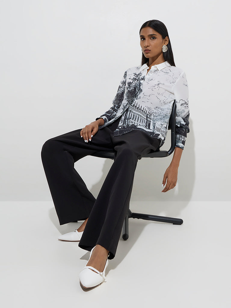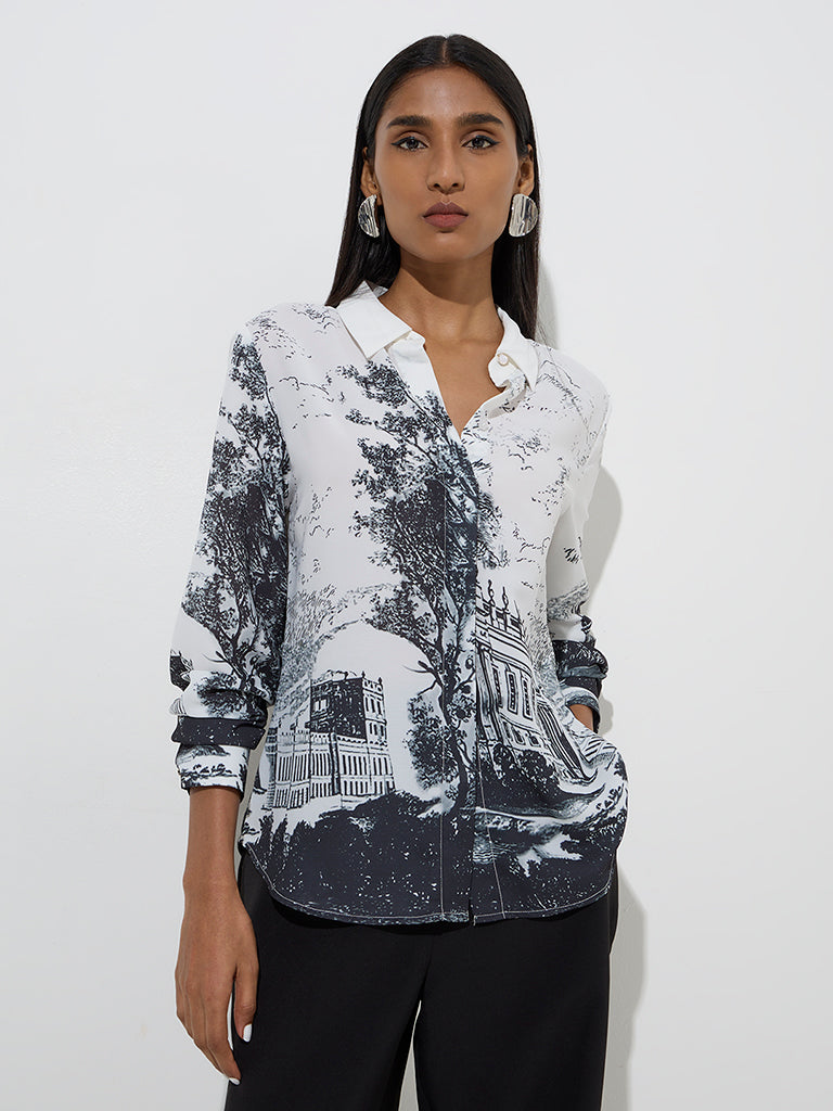 This black shirt from Wardrobe is adorned with a scenic-inspired print. Spun from a super-soft fabric. it carries a classic collar. an embellished button placket. and full sleeves for a sophisticated finish.