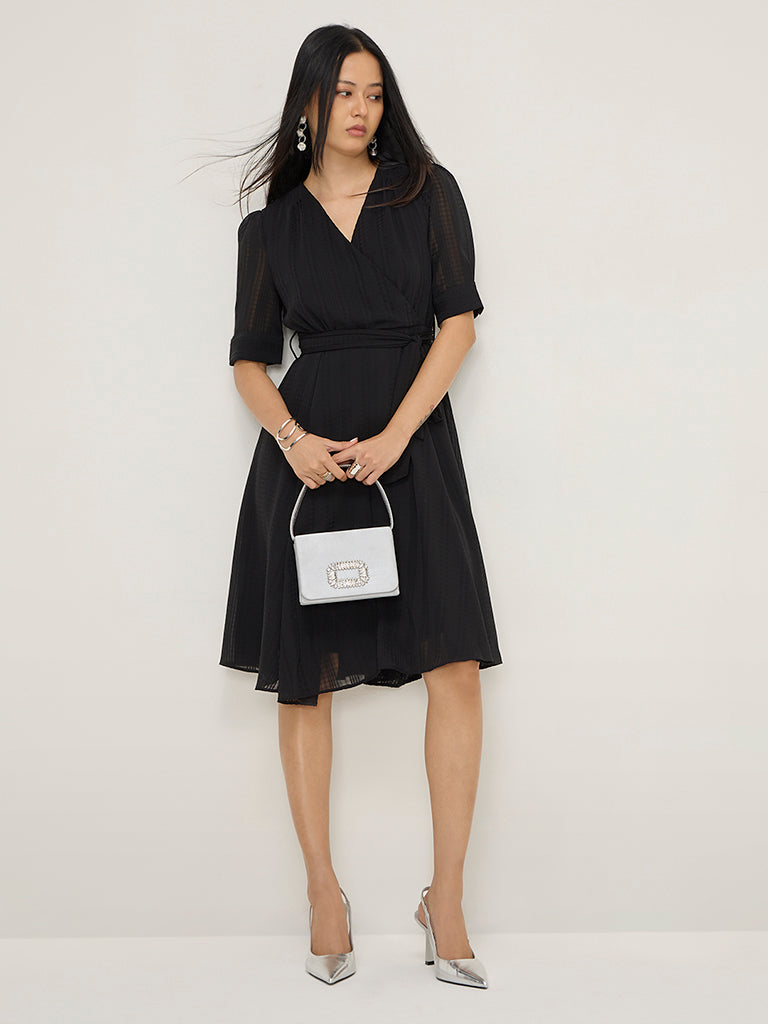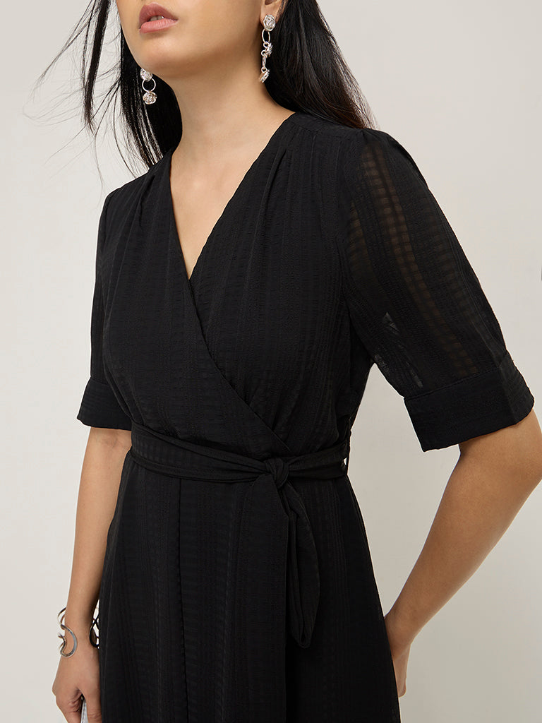 This black dress by Wardrobe is designed with a seersucker texture. Carved in an A-silhouette. the quality fabric garment offers elegant pleated detailing. It is completed with a wrap-style V-neck and puffed sleeves.