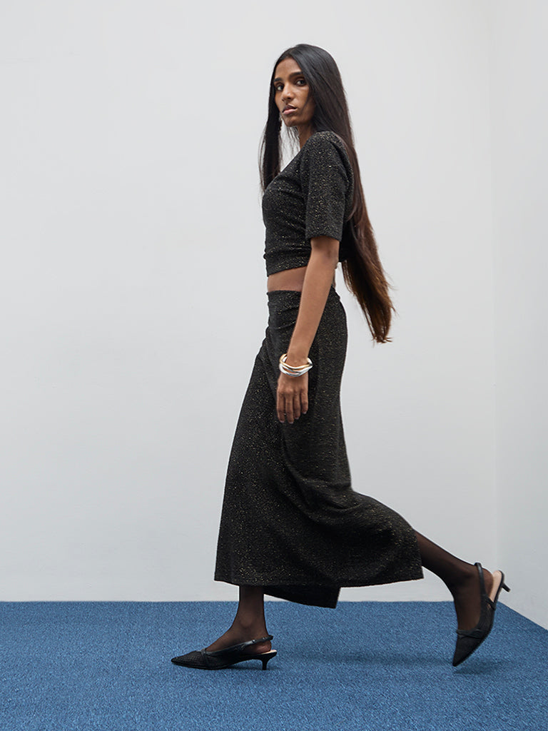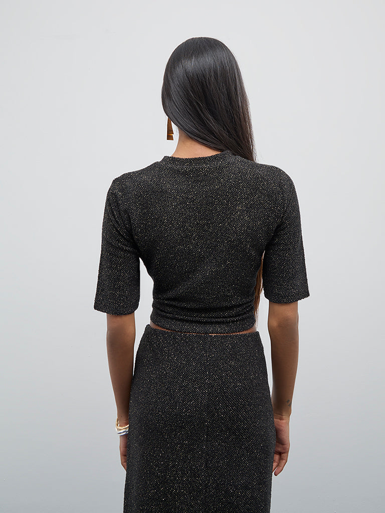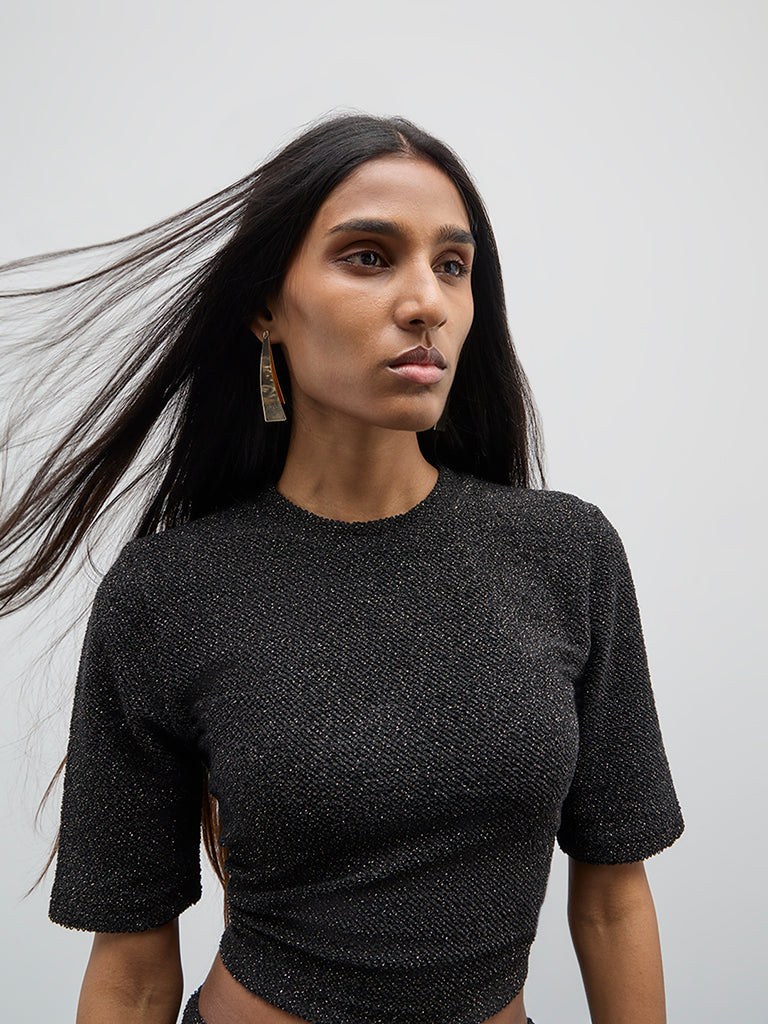 This black top from Wardrobe flaunts shimmer detailing. Made from a knit-textured fabric. it is complete with a crew neck and half sleeves.
