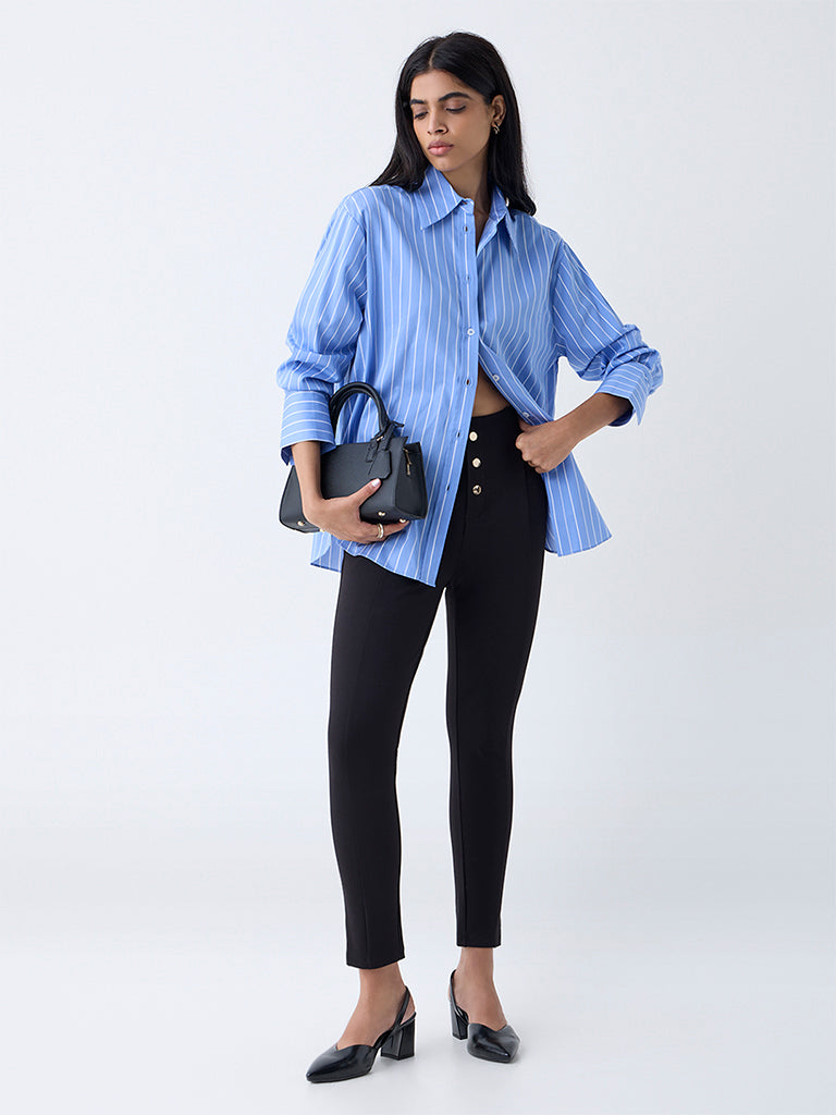 These black high-rise trousers from Wardrobe are designed for a sleek. flattering fit. They feature a smooth elastic waistband for effortless comfort and gold-toned button detailing that adds a touch of refined elegance.