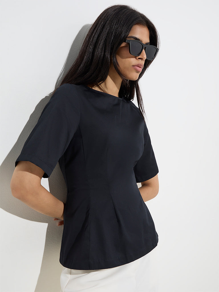 Wardrobe introduces this black top tailored in a peplum silhouette and crafted from pure cotton fabric. Fitted with a round neck and half sleeves. it is finished with a back zipper placket for easy wear.