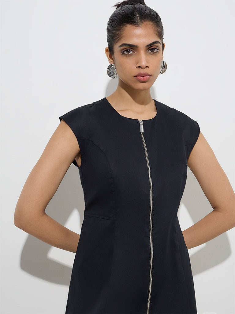 This black dress from Wardrobe is sculpted in a straight silhouette. featuring a round neck. cap sleeves and a zipper front. Finished with side pockets. it blends effortless style with everyday sophistication.