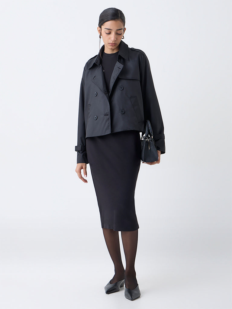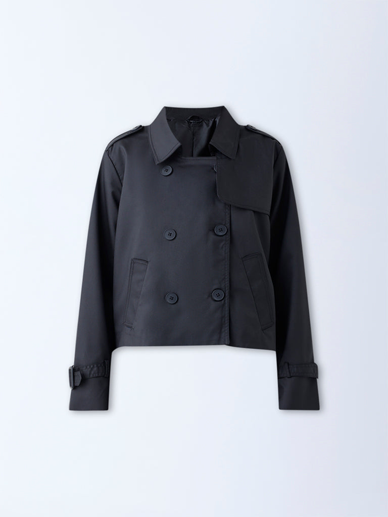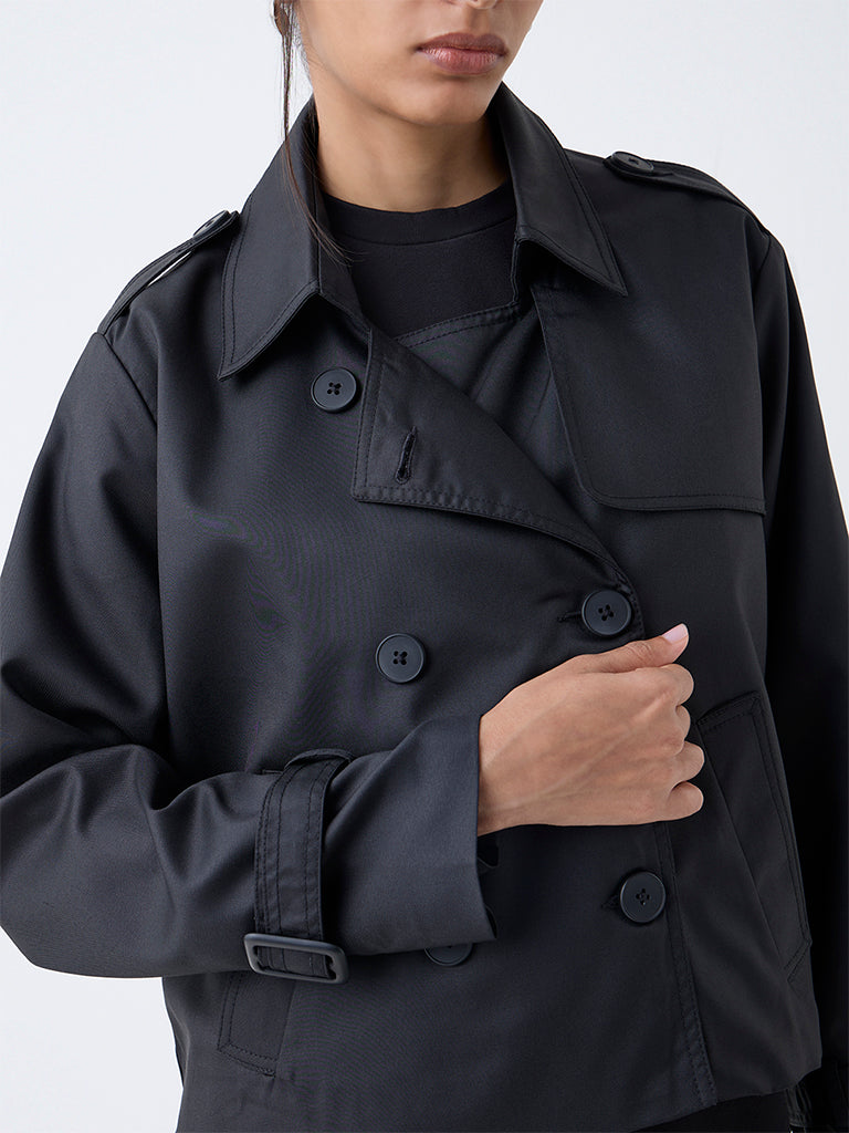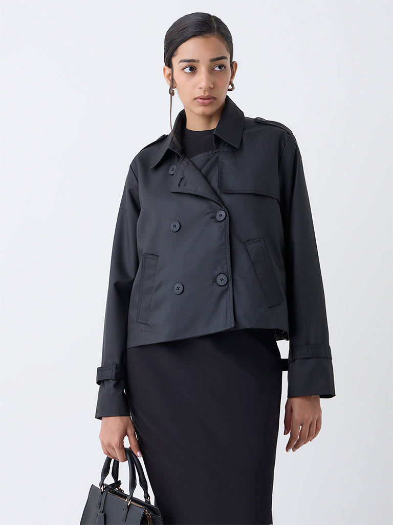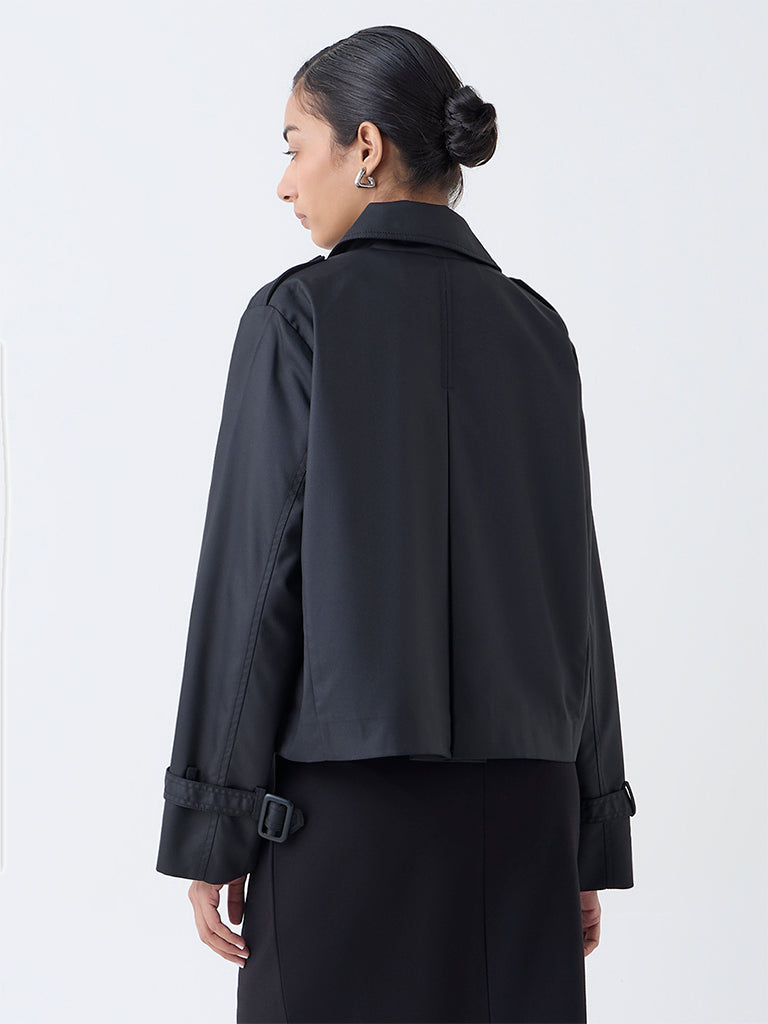 Wardrobe presents this black jacket styled with a notch lapel collar. a button-up front and full sleeves. It is finished with kangaroo pockets for a structured fit. Made from high-quality fabric. it offers a smooth feel and a tailored drape that enhances its refined appeal.