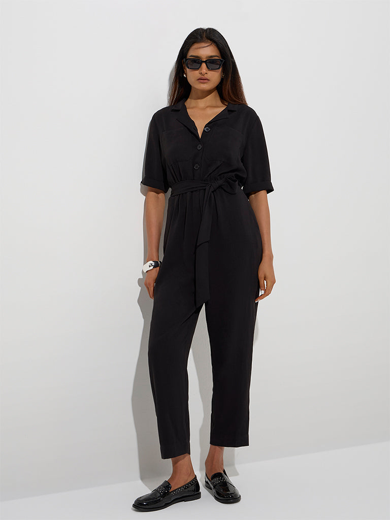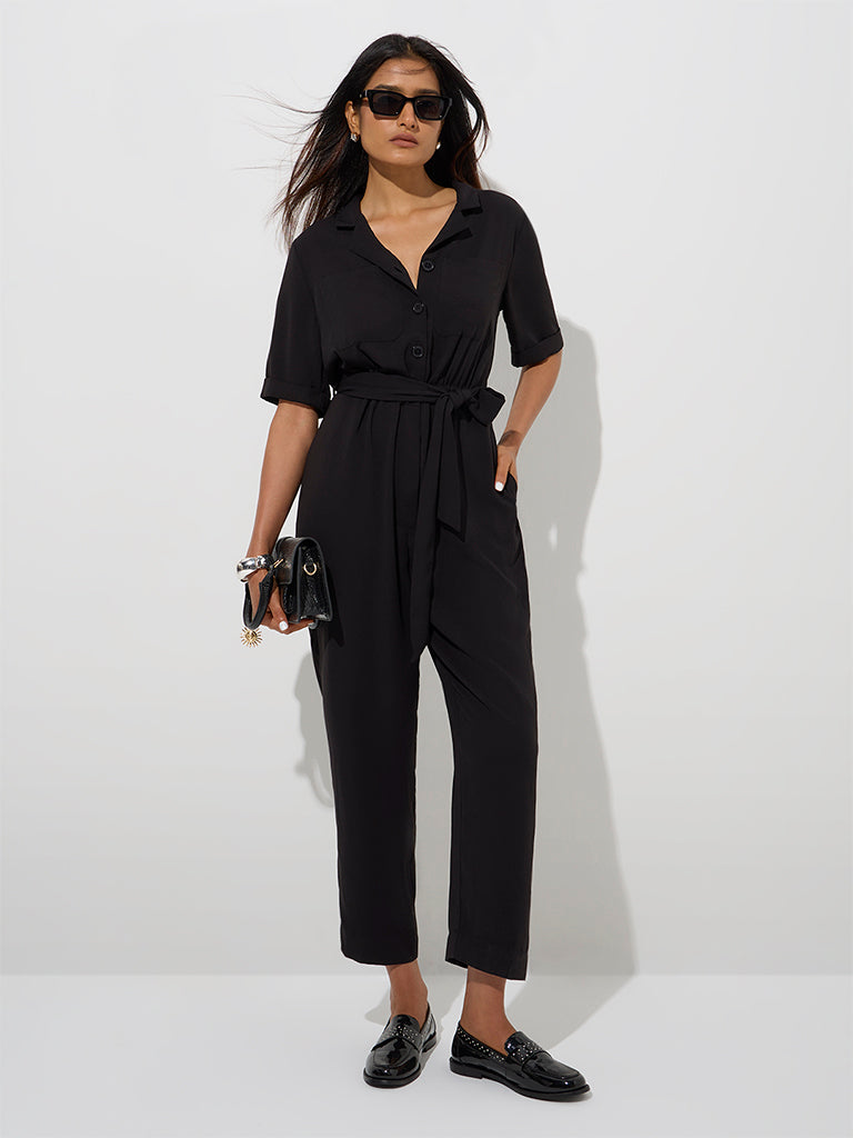 This black solid jumpsuit from Wardrobe is created from a super-soft fabric and finished with functional side pockets for everyday ease. It features a camp collar. half sleeves. and a button placket for a structured silhouette. Two chest pockets and belt loops add utility. while a detachable belt offers a personalized fit.
