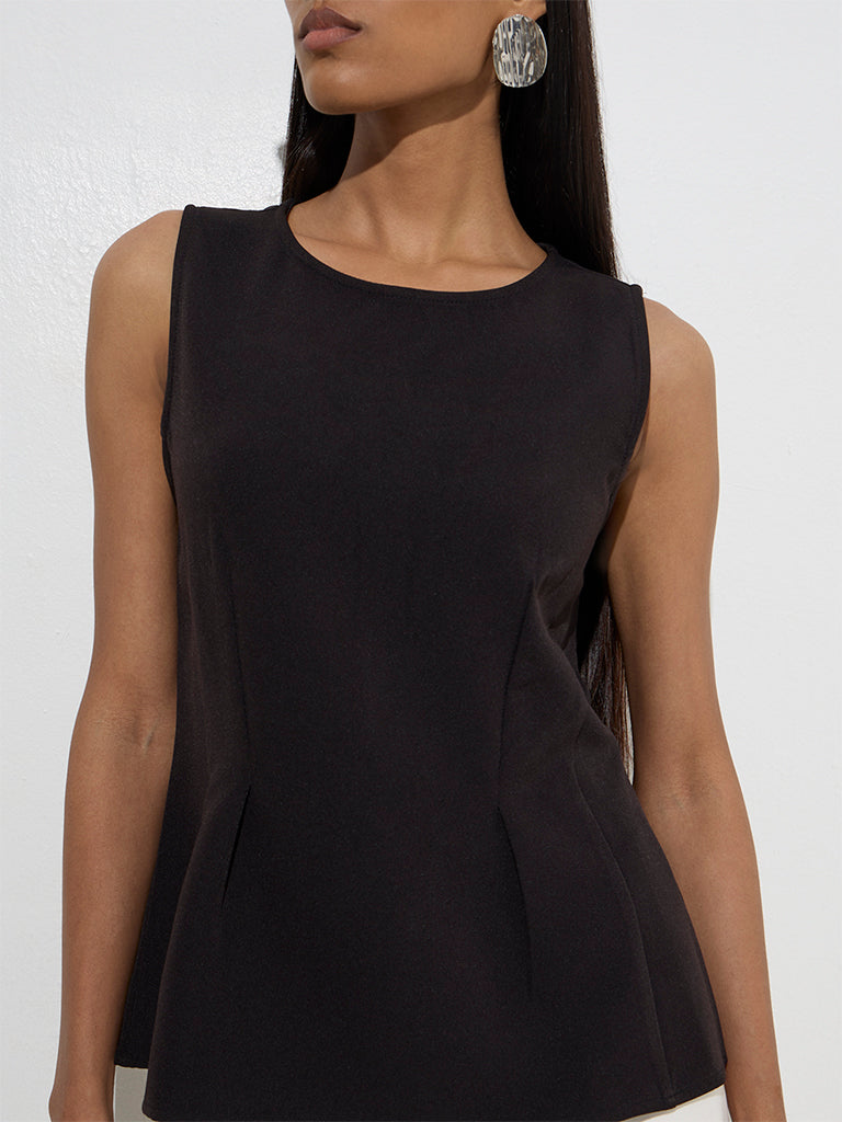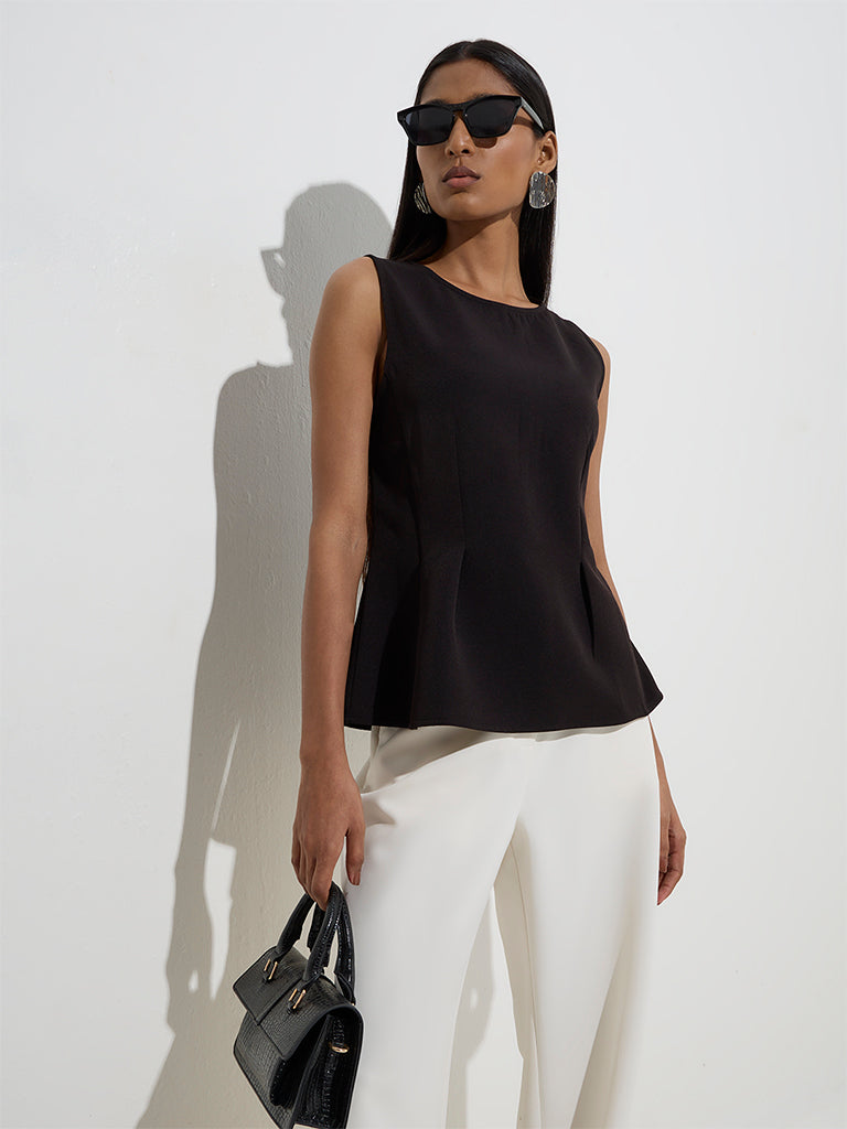 This black top from Wardrobe is woven from a lightweight fabric and tailored in a flattering peplum silhouette. It features a round neckline and is finished with a concealed back zipper for a clean. polished look.