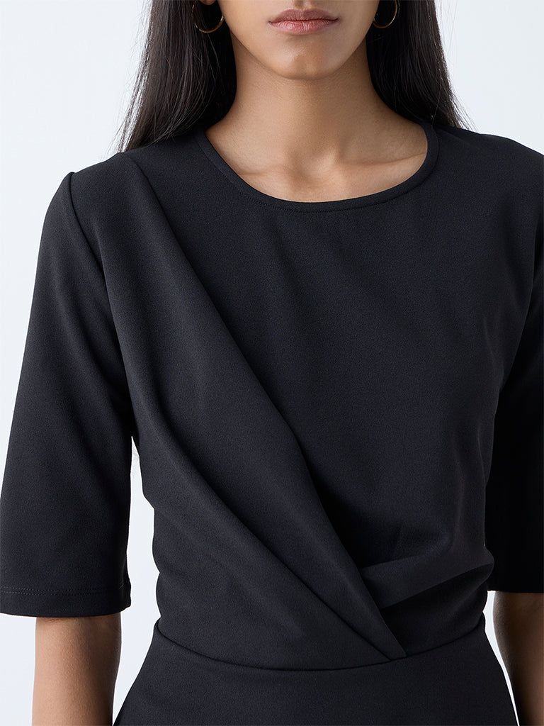 Revamp your work wardrobe with this sleek black peplum top from Wardrobe. Tailored with a round neck and half sleeves. it features a gently flared silhouette that defines the waist while allowing effortless movement.