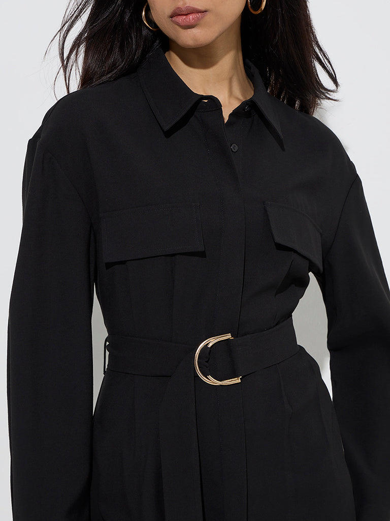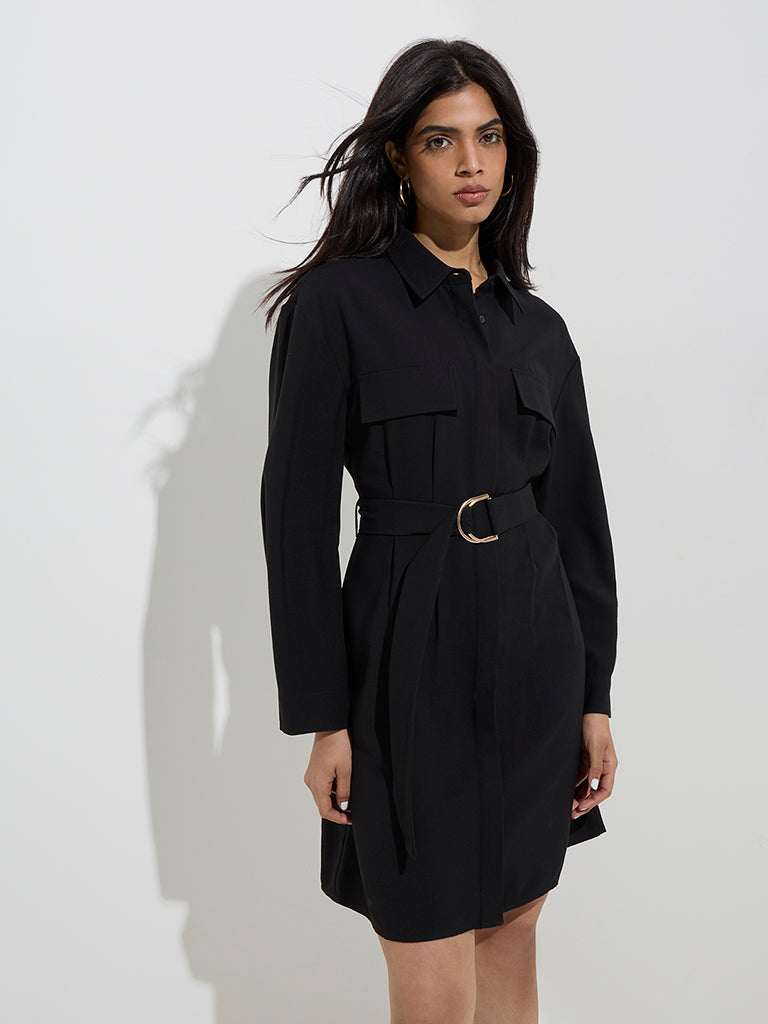 This black shirtdress from Wardrobe exudes timeless sophistication. Designed with a smart collar and full sleeves. it features a concealed button placket and imitation flap pockets for a structured finish. Crafted from a lightweight fabric. it is completed with a detachable belt that cinches the waist for a flattering fit.