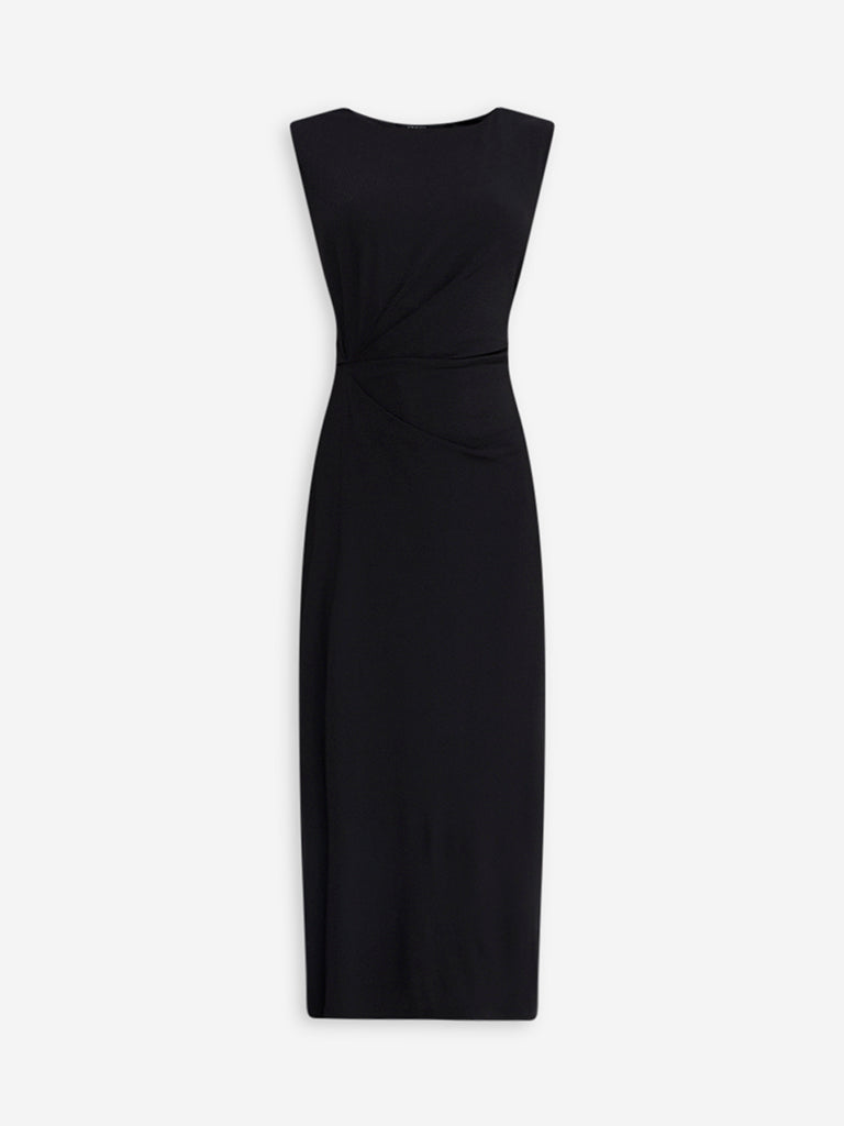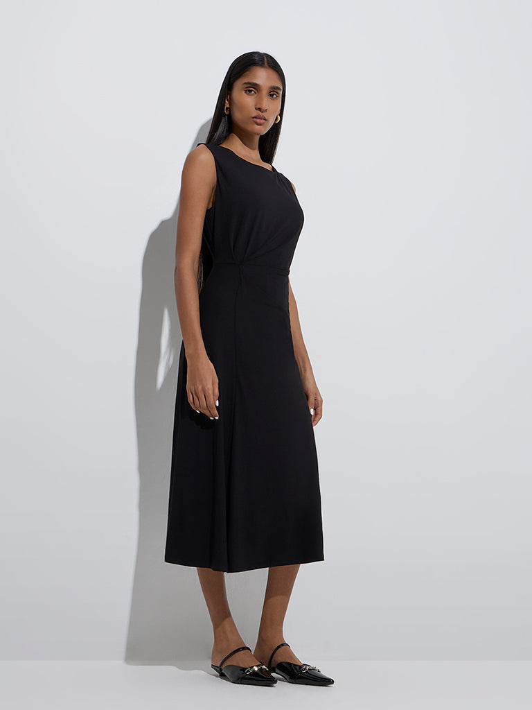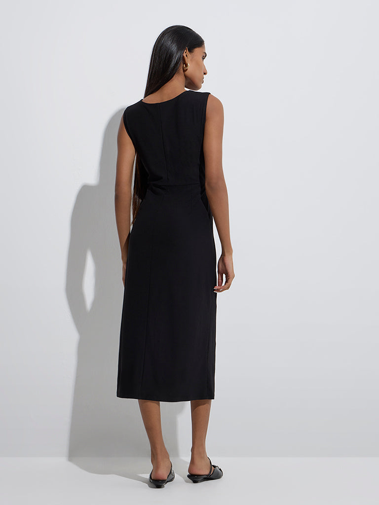 This black dress from Wardrobe is fashioned in a straight silhouette from a lightweight fabric for effortless elegance. Designed with subtle ruching at the front. it features a round neck and a sleeveless cut for a breezy finish.