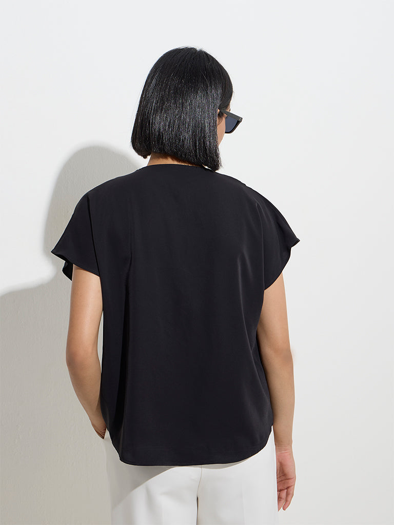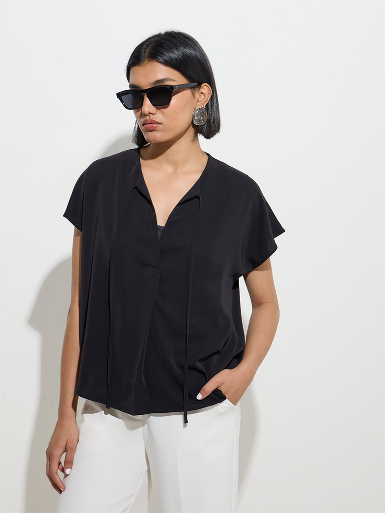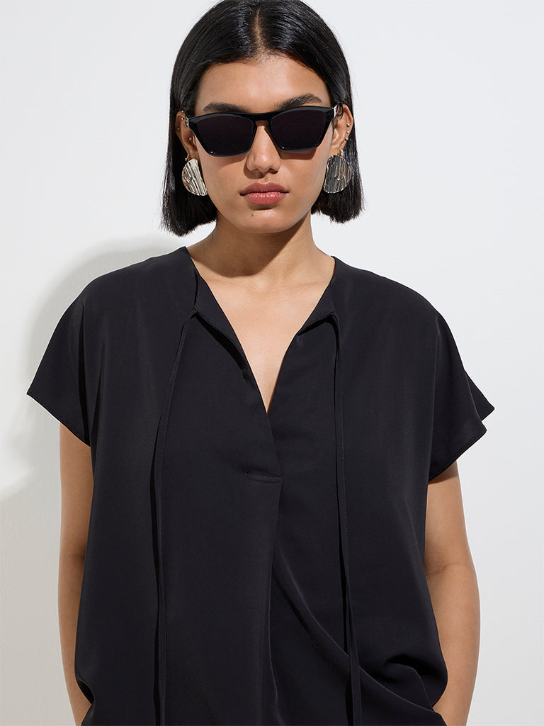 Wardrobe launches this black top in a minimalistic profile. Made from breathable fabric. it features a tie-up detail at the neckline and relaxed dolman sleeves for effortless elegance.