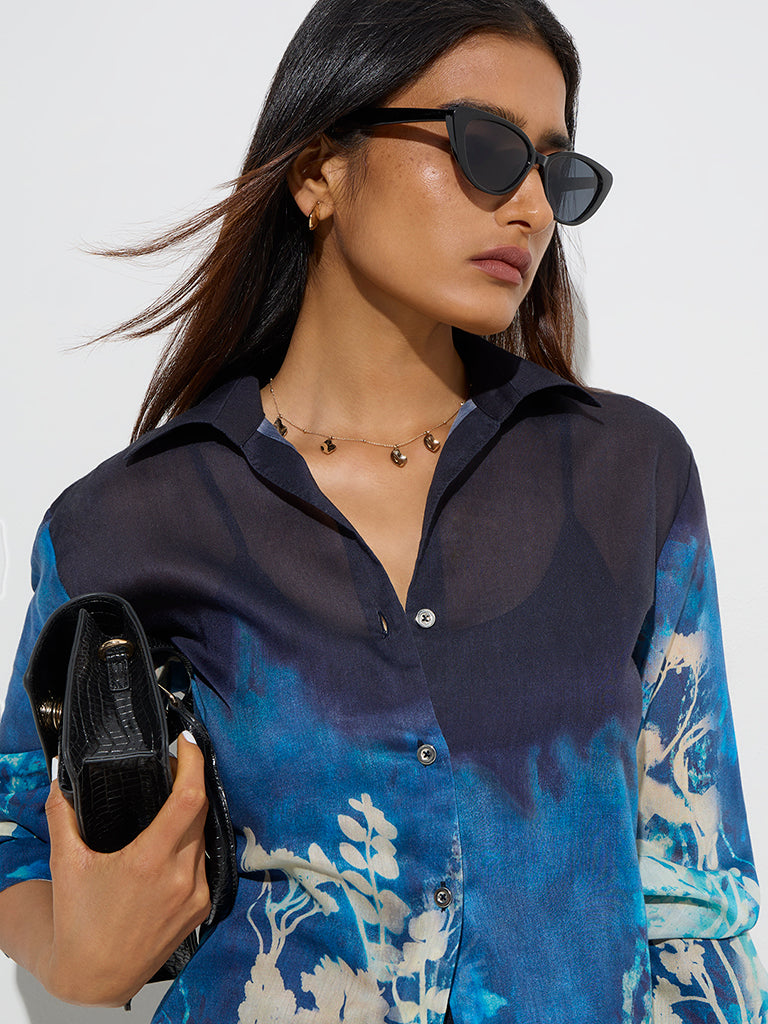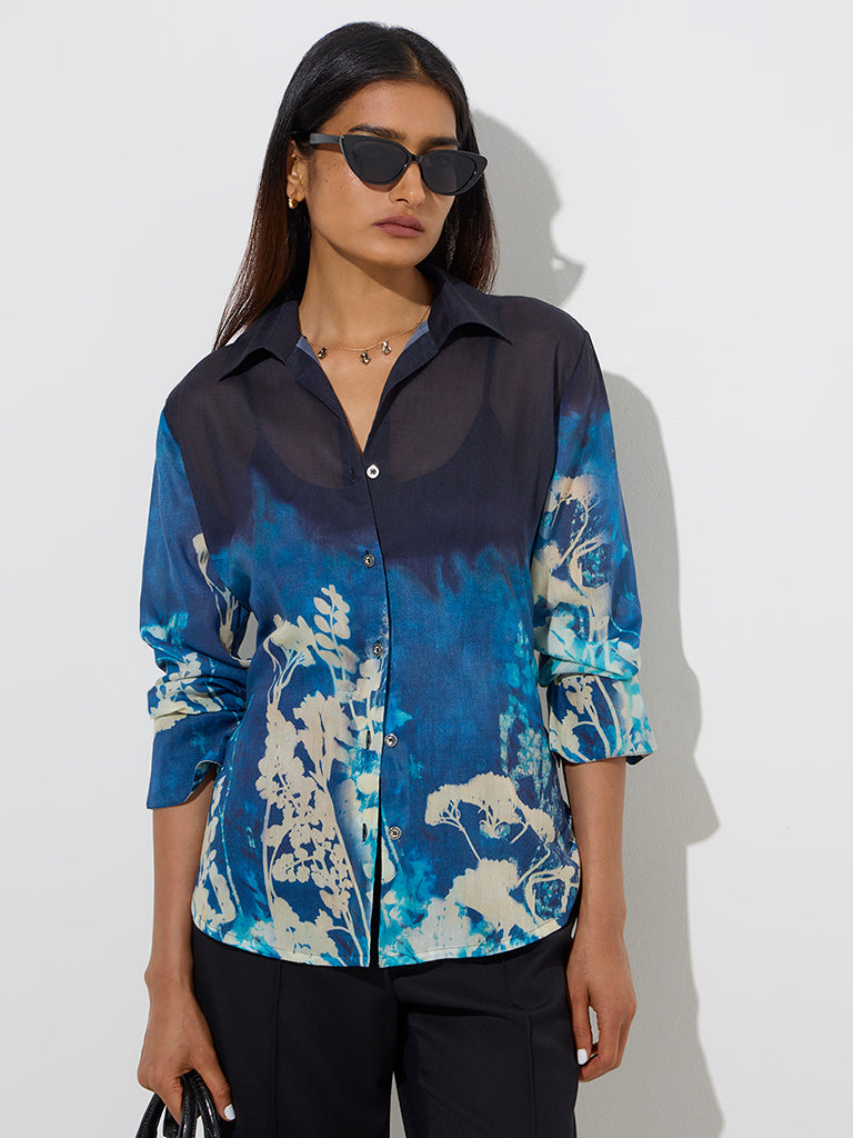This blue shirt from Wardrobe showcases a botanical print on a dual-toned base. offering a fresh and vibrant look. Crafted from premium fabric. it features a classic collar. button placket. and full sleeves. It is complemented by a supersoft camisole for added coverage.