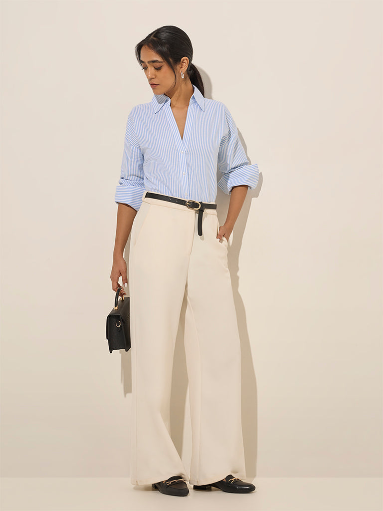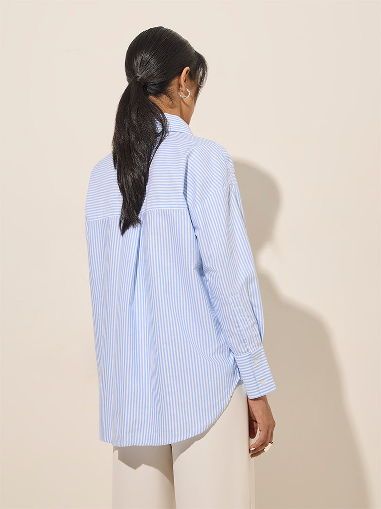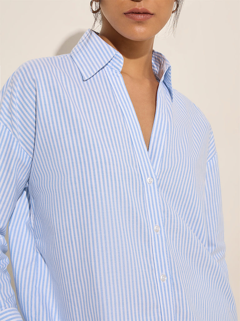 Wardrobe presents this light blue shirt adorned with subtle striped prints. It features a V-neck collar. a buttoned placket. and buttoned cuffs. Crafted from pure cotton. it ensures a breathable and comfortable feel for all-day wear.