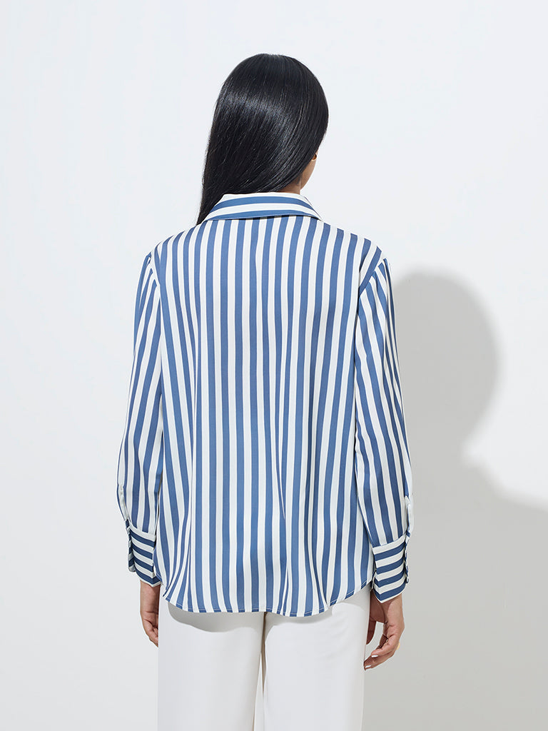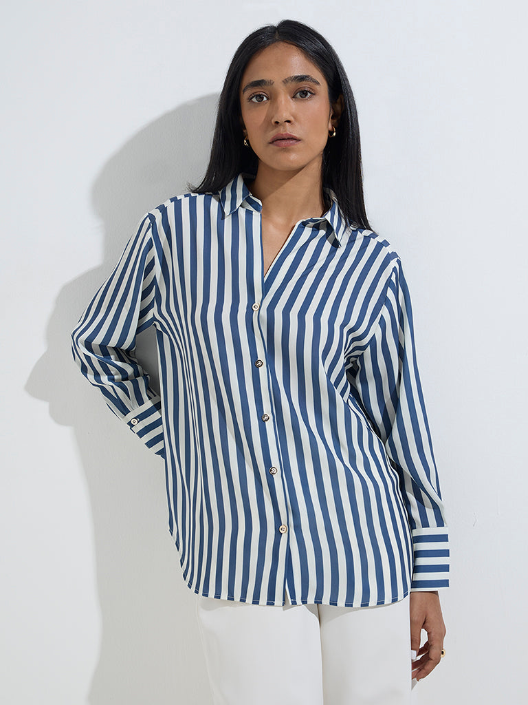 This blue shirt by Wardrobe is designed with blue stripes. Crafted from quality fabric. it boasts a shirt collar. button down front and full sleeves.