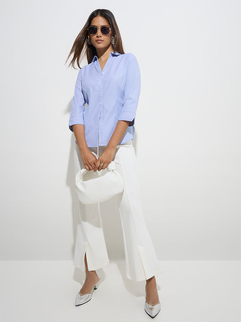Wardrobe presents this blue striped shirt. crafted from a soft cotton-blend fabric. Designed with a flattering V-neckline. it extends into a button-up front and is finished with3/4th sleeves for a polished look.