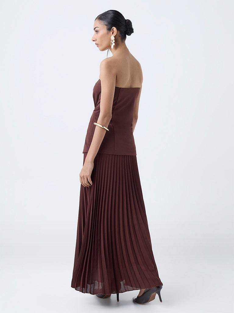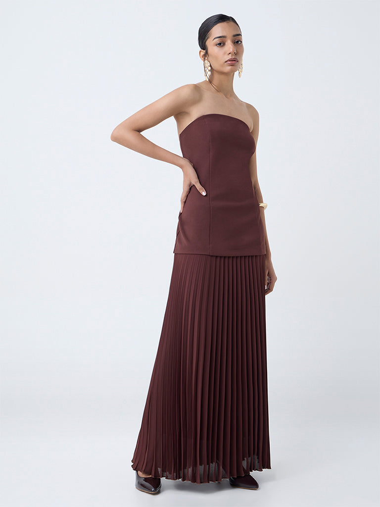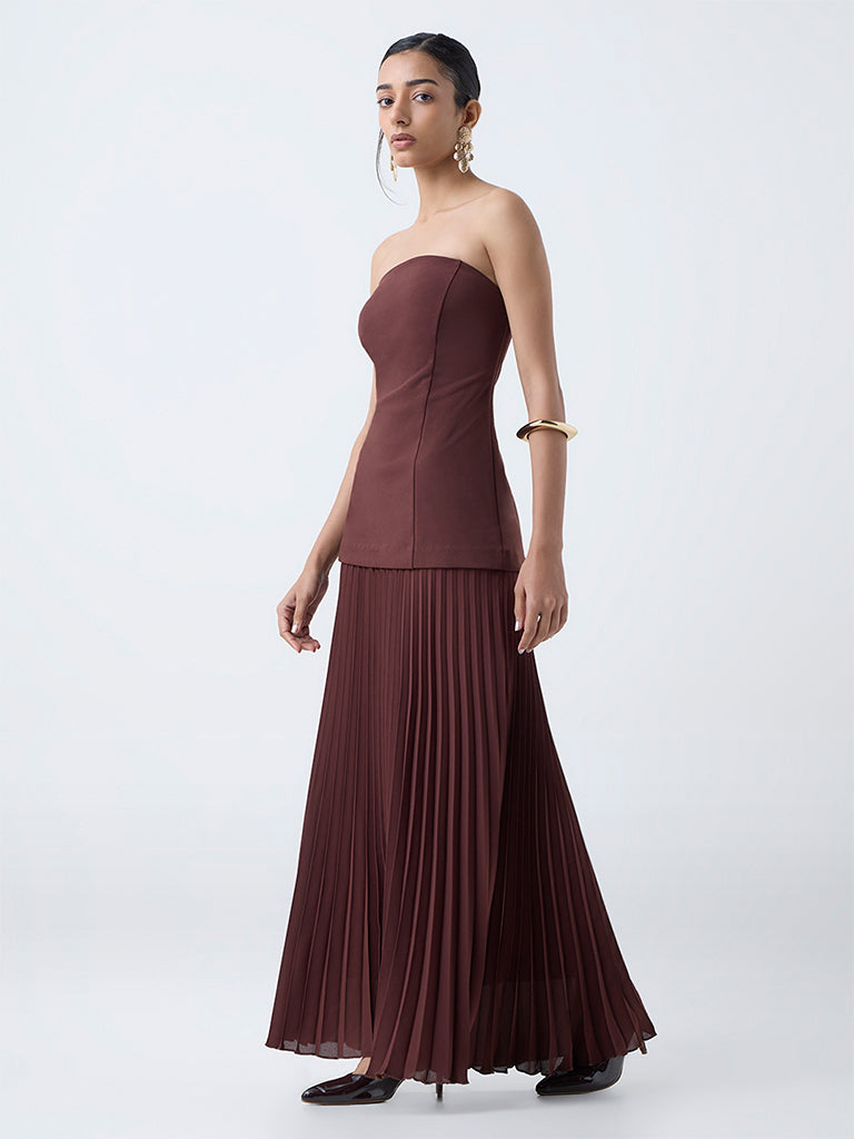 Wardrobe presents this brown tube dress. where structure meets fluidity. The fitted bodice lends a confident shape before flowing into accordion pleats that move beautifully with every step. Made from breathable fabric and finished with a concealed side zip. it is designed to feel as easy as it looks polished.