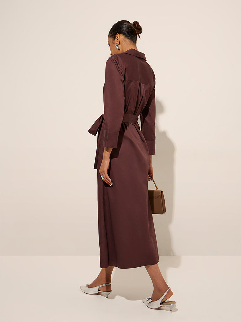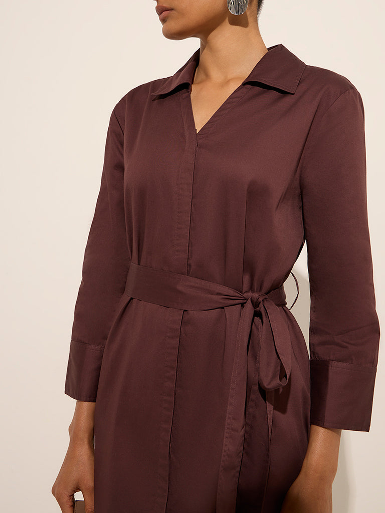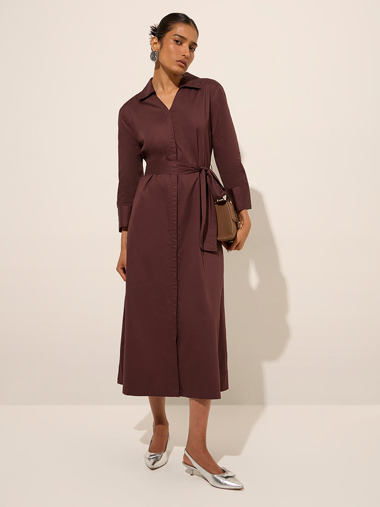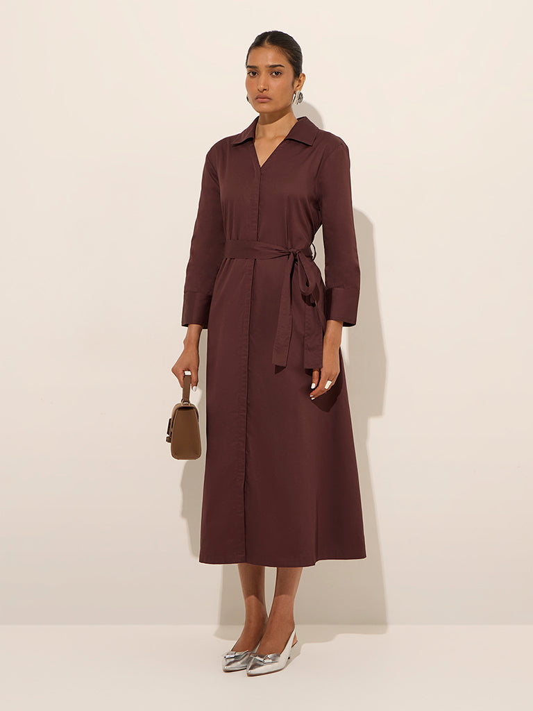 Wardrobe Brown Cotton A-Line Belted Shirt Dress with Belt