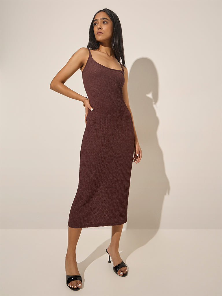 Wardrobe presents this brown dress crafted from crinkle-textured fabric. It features a scoop neckline and adjustable straps. while the bodycon silhouette ensures a well-sculpted. flattering fit.