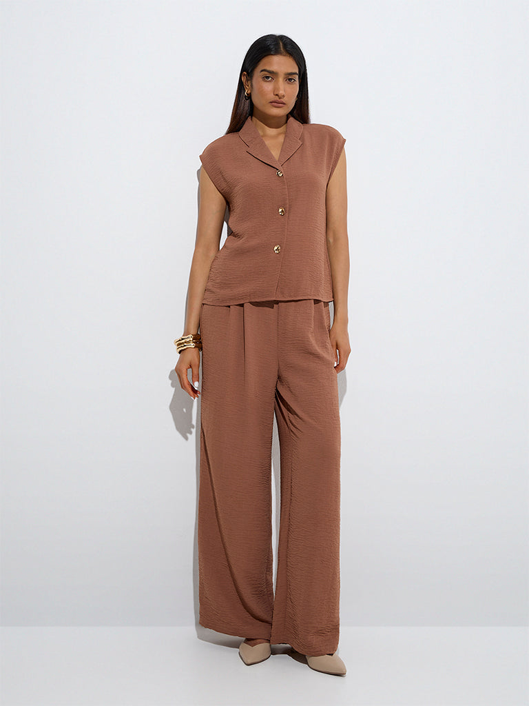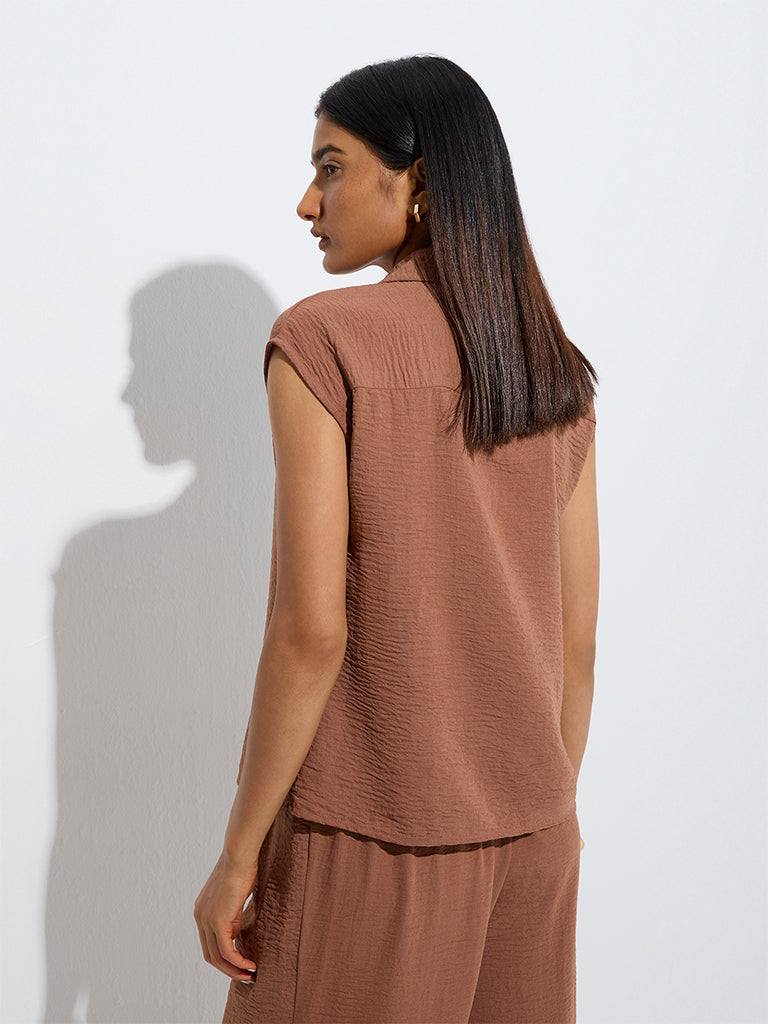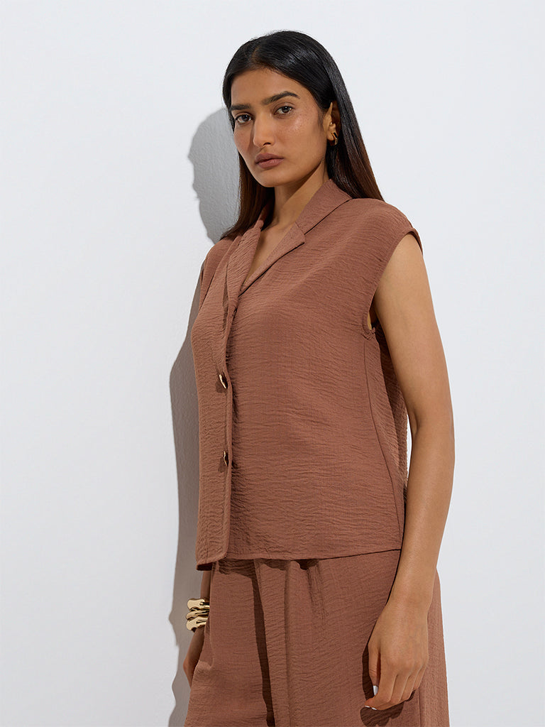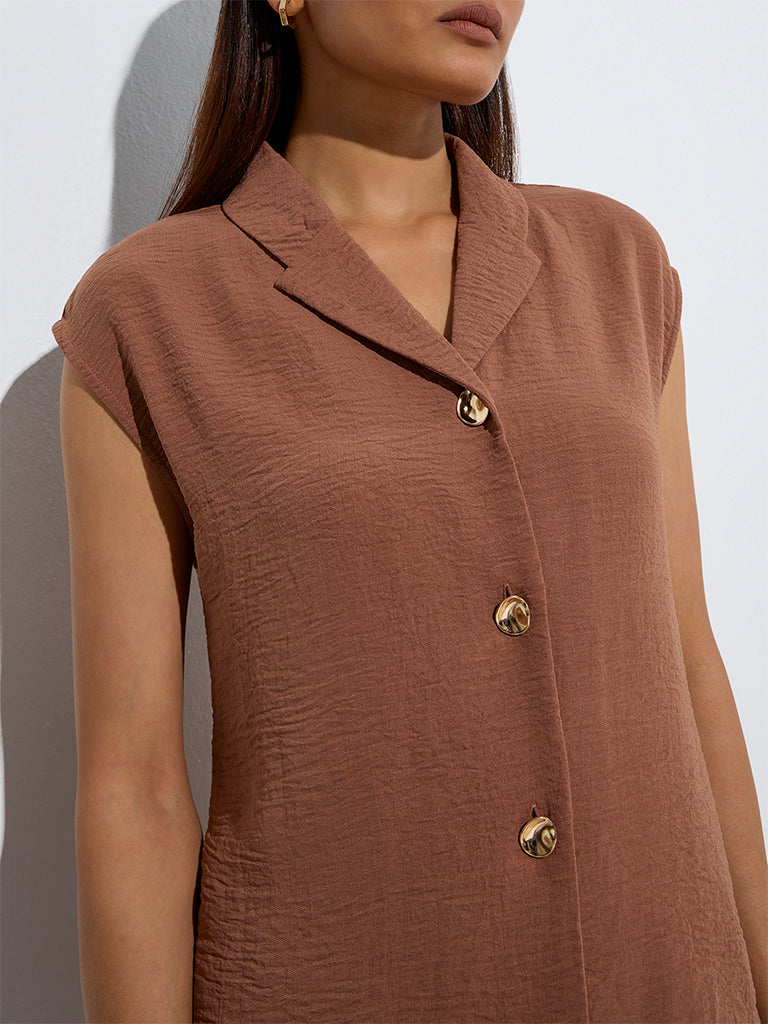 Crafted from a cosy crinkle-textured fabric. this brown jacket from Wardrobe brings effortless elegance to everyday dressing. It features cap sleeves and a shirt collar that flows into a button placket. adding a polished finish to its refined silhouette.